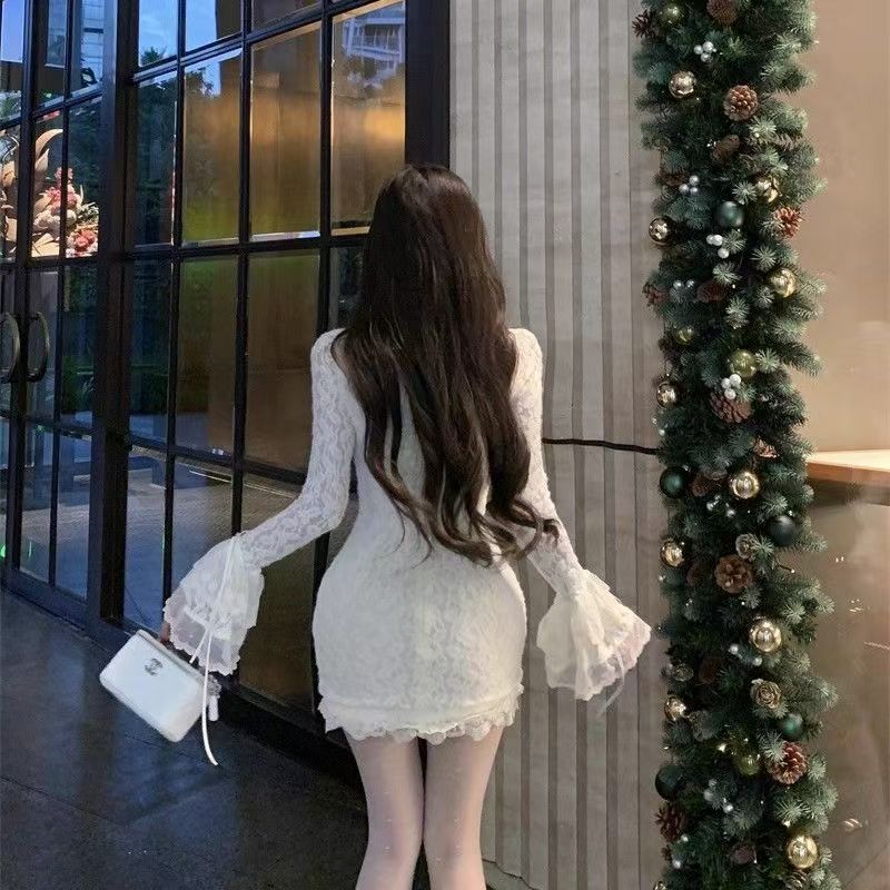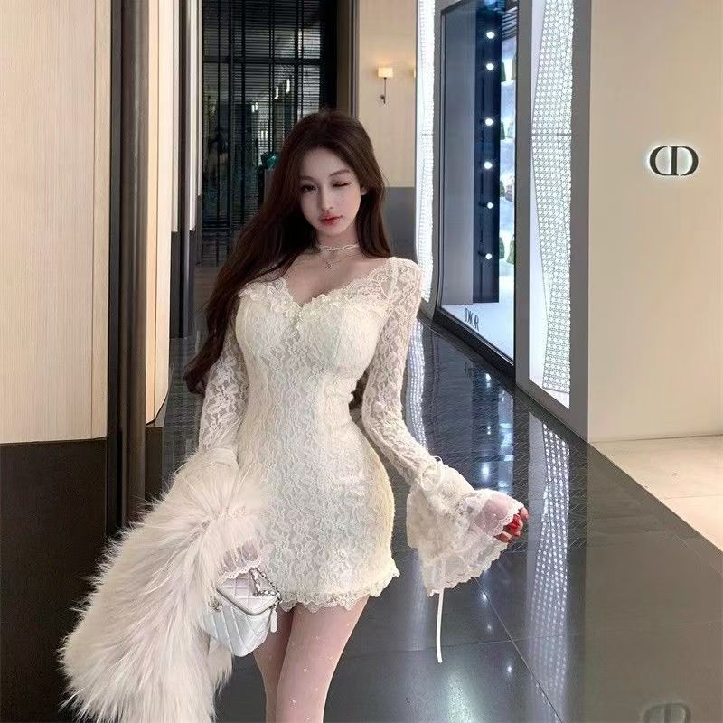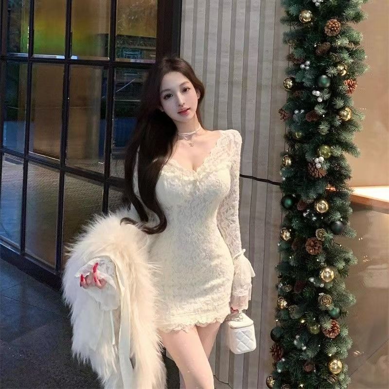 YF6853-图片色新春新品甜美时尚木耳边系蝴蝶结长袖V领弹力修身包臀蕾丝连衣裙