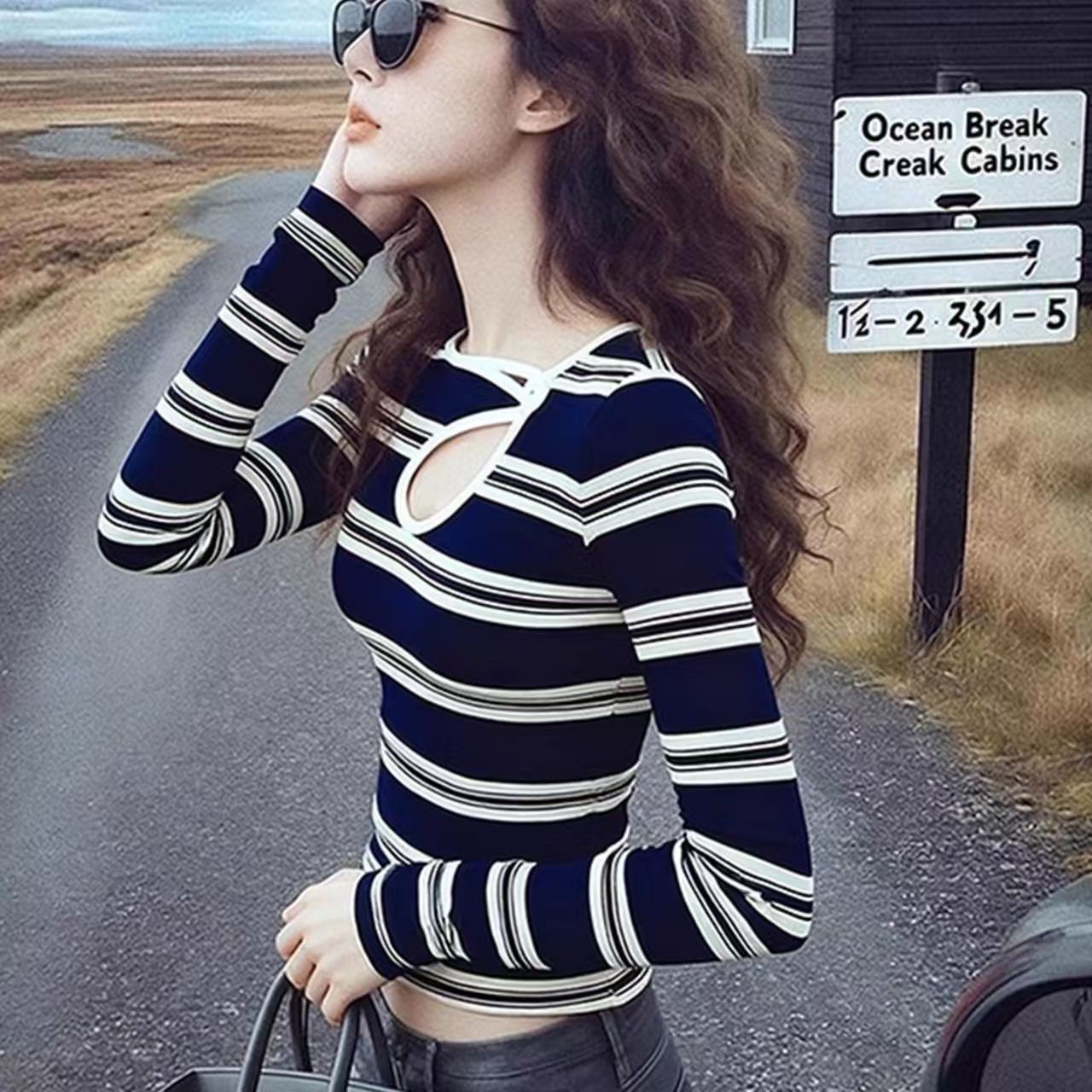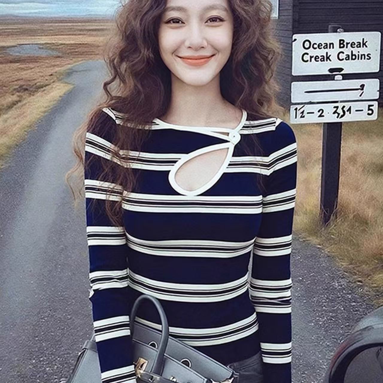 YF6854-图片色早春新款镂空黑白撞色条纹弹力显瘦长袖套头复古气质上衣