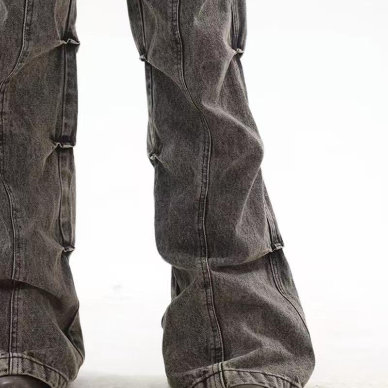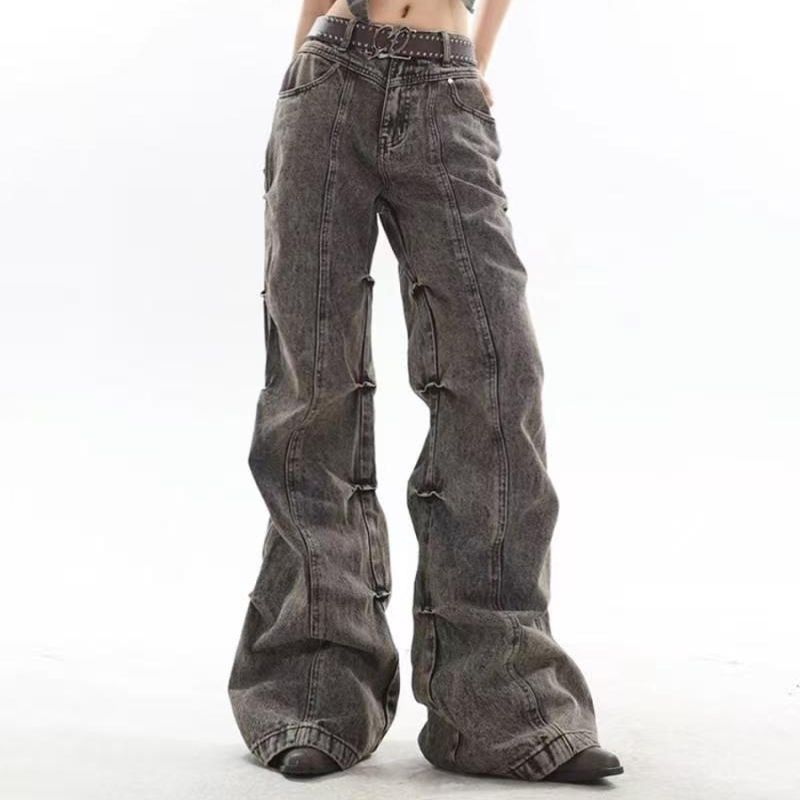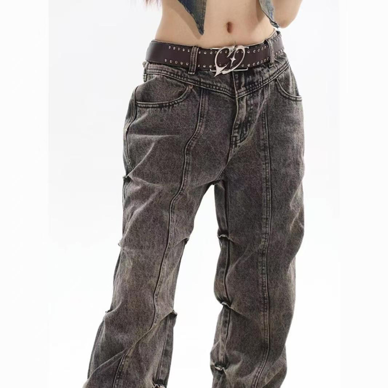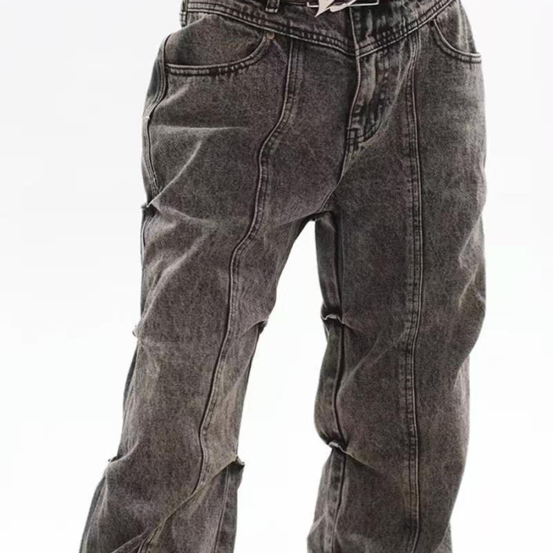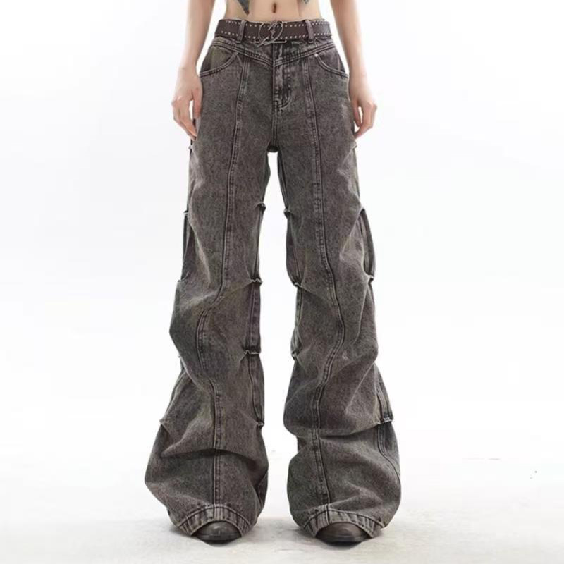YF6856-图片色美式复古风褶折压纹小心机洗水烟灰色阔腿高街感牛仔裤