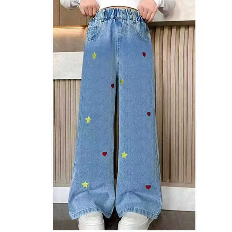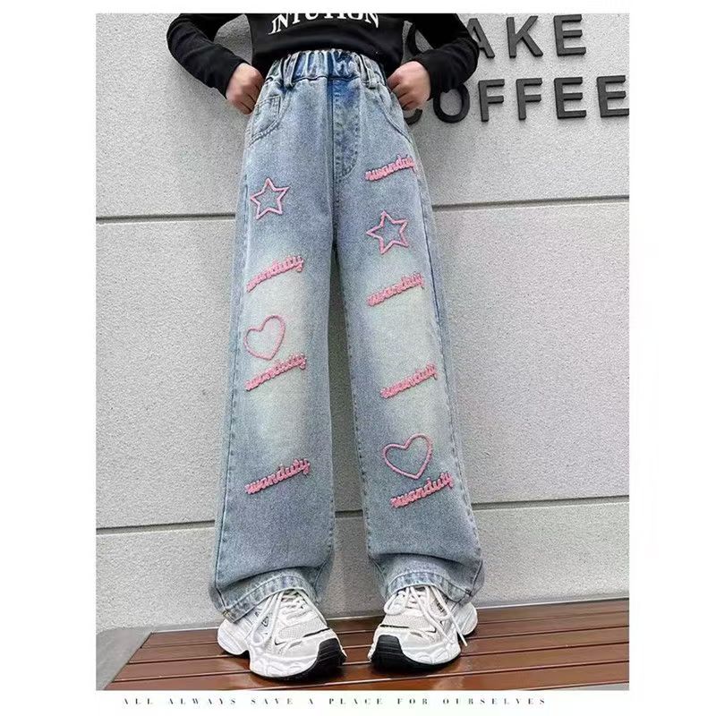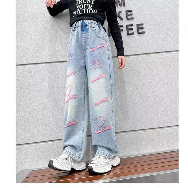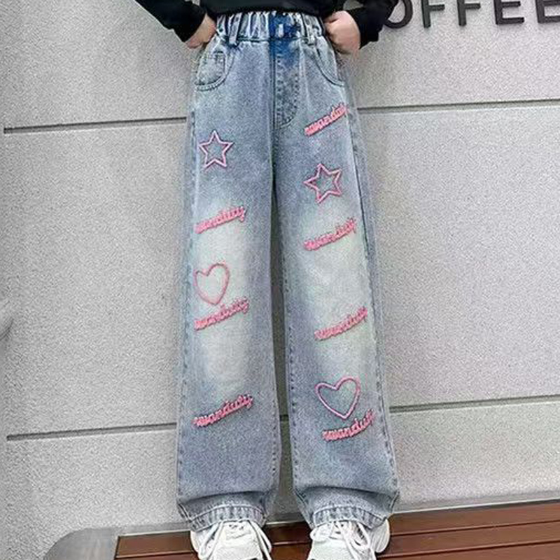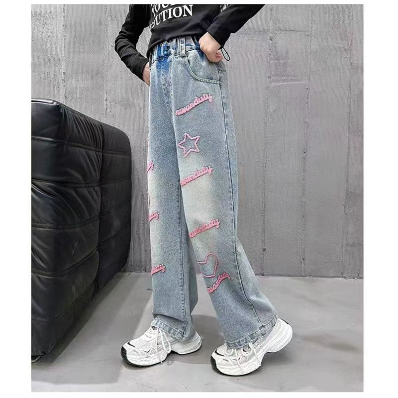 TF6858-(2色入内)时尚港式爱心刺绣设计感松紧腰直筒坠地感休闲百搭牛仔裤