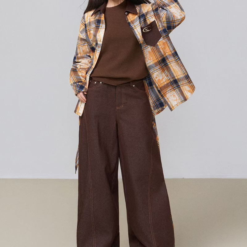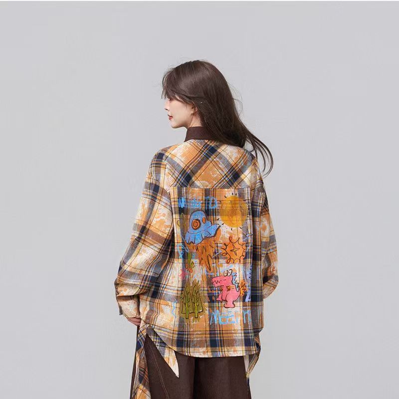 YF6859-图片色时尚洋气后背涂鸦字母印花慵懒风长袖翻领撞色小众格子衬衣