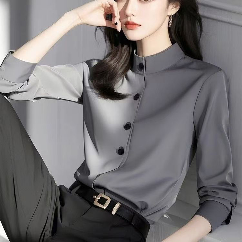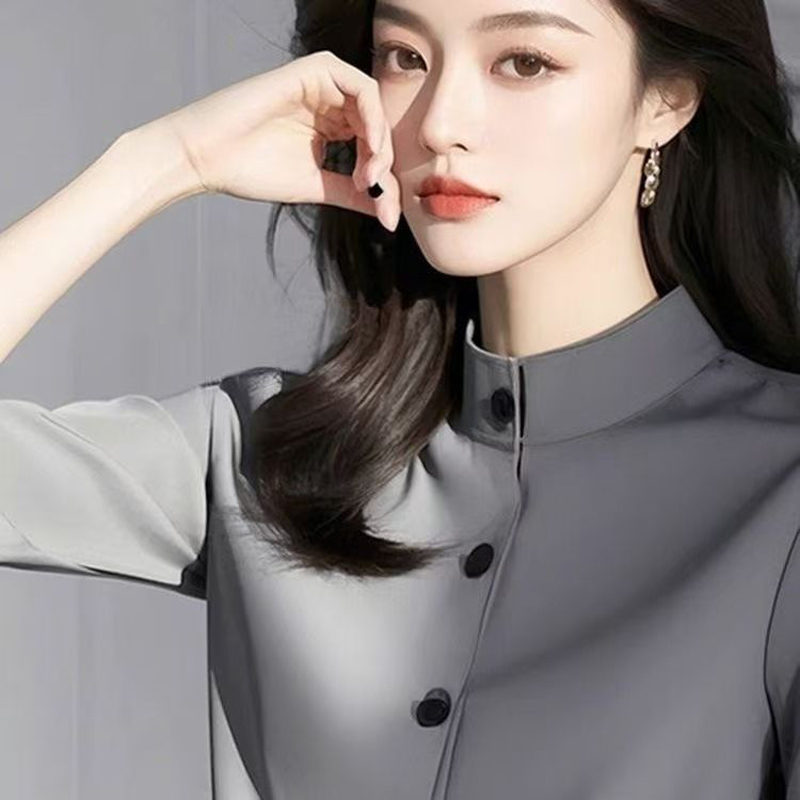 YF6869-图片色法式复古风立领长袖宽松大码灰色春秋时尚百搭精品衬衣