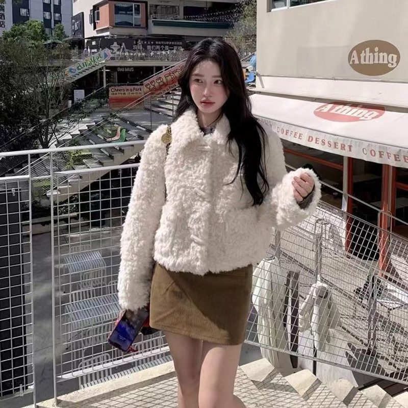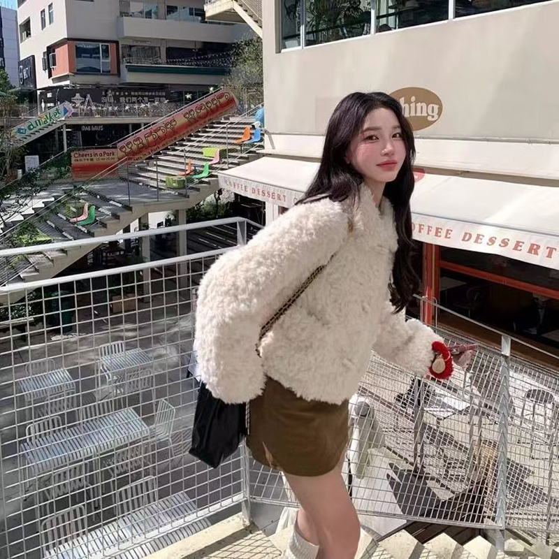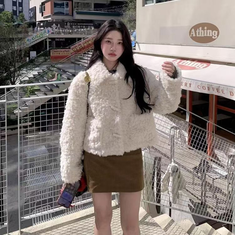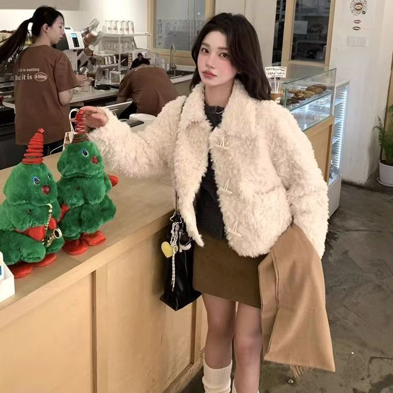 YF6870-图片色冬天保暖羊羔绒牛角扣翻领长袖翻领短装小香风设计外套