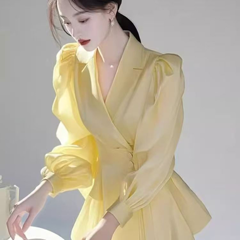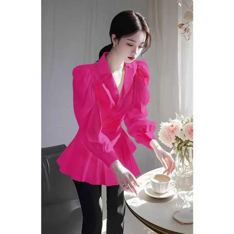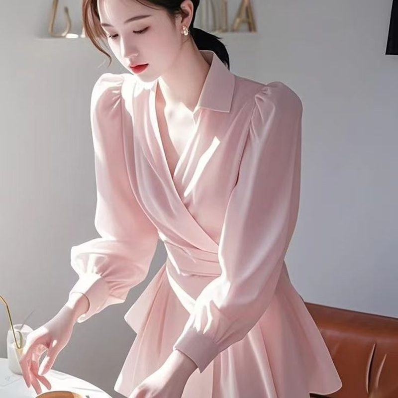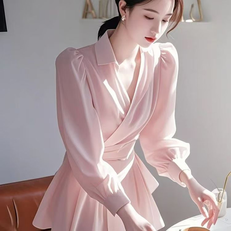 YF6885-(6色入内)早春新款褶折泡泡袖翻领交叠设计修腰轻奢感雪纺上衣