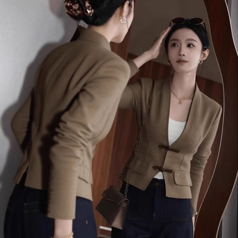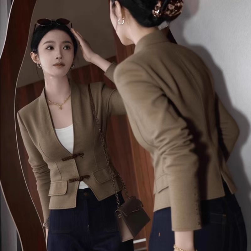YF6889-图片色休闲春秋百搭长袖系扣收腰显瘦复古棕色个性短款夹克上衣