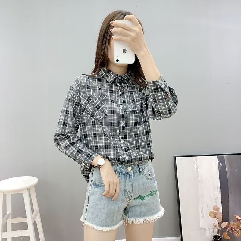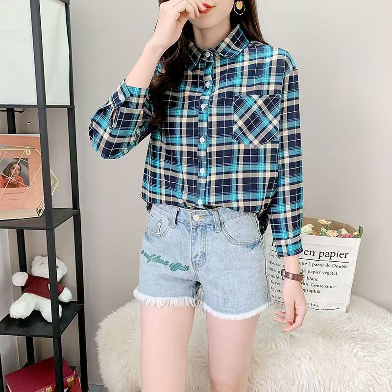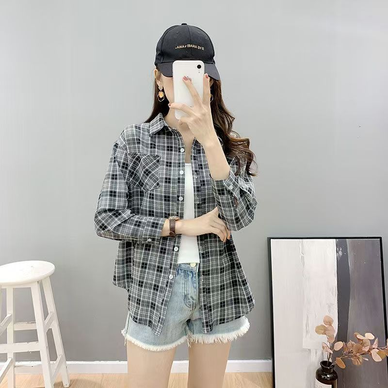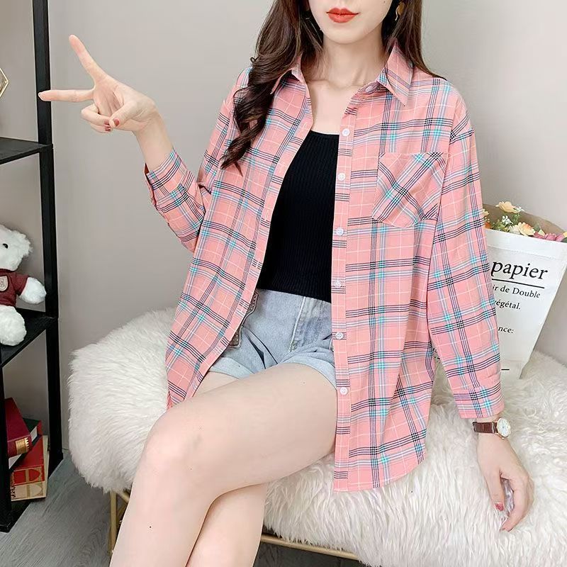 YF6891-(3色入内)韩版春装学院风格子衬衫 长袖翻领宽松显瘦大码上衣
