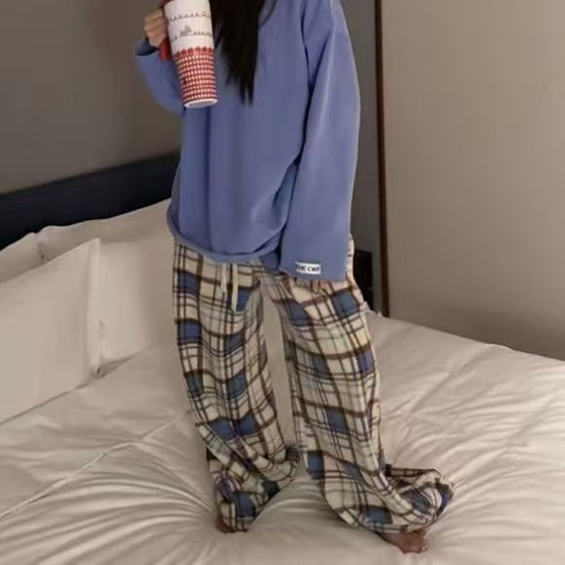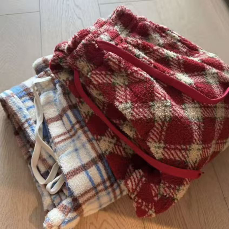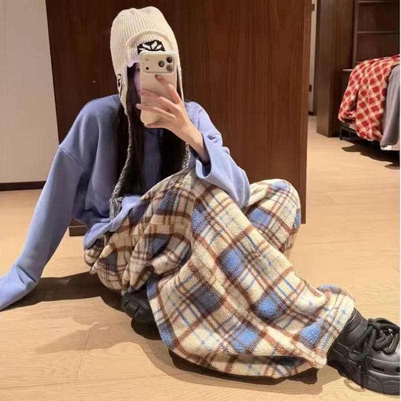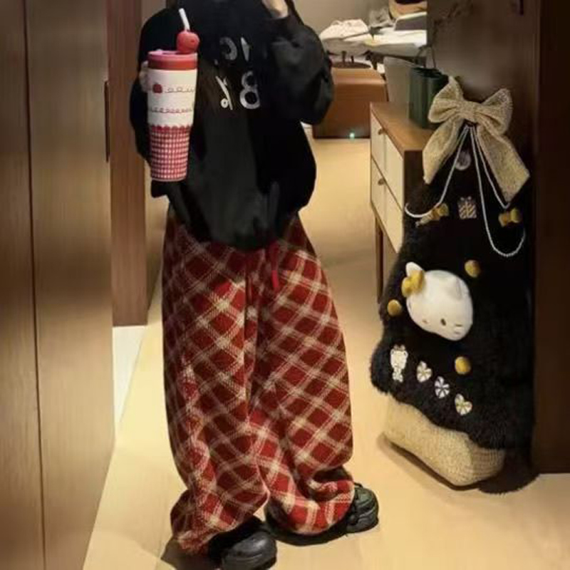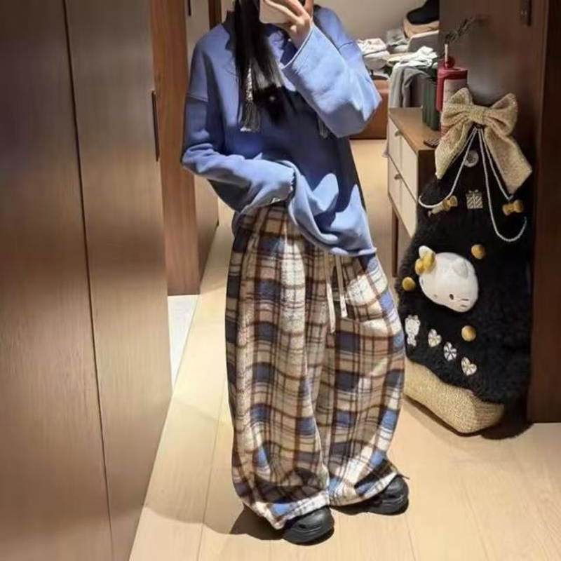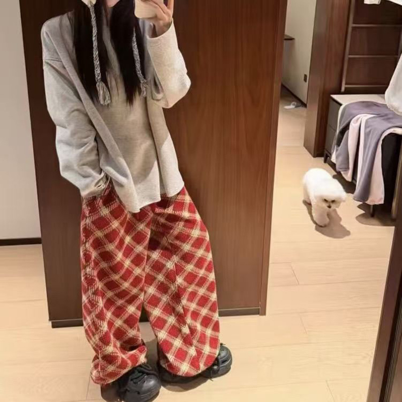 YF6892-(2色入内)冬季时尚毛呢格子松紧腰直筒坠地感阔腿休闲复古长裤