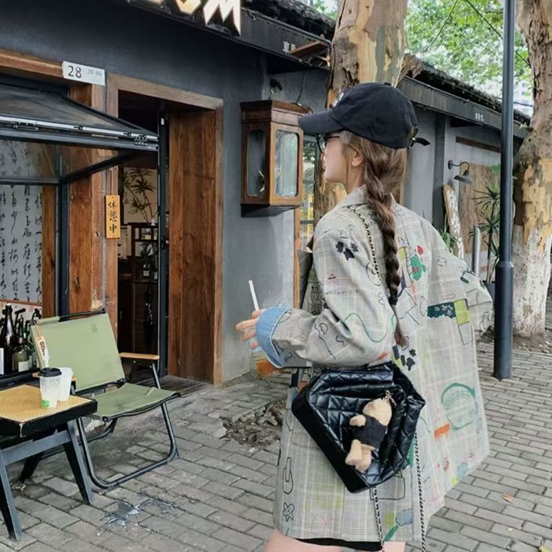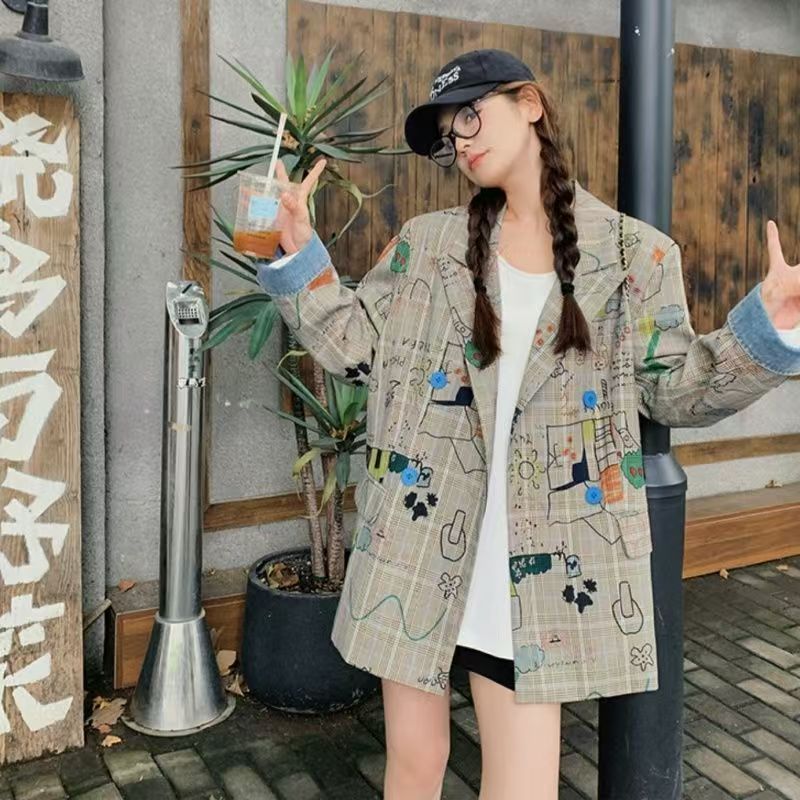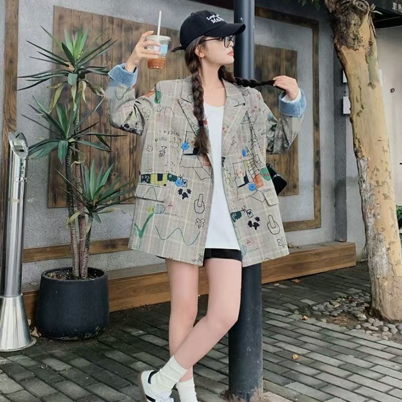 YF6893-图片色时尚个性涂鸦薄款长袖翻领V字系扣宽松街头风休闲西装