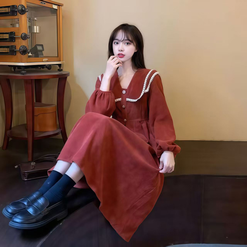 YF6899-(3色入内)秋冬甜美娃娃领泡泡袖松紧腰显瘦灯芯绒保暖复古风连衣裙