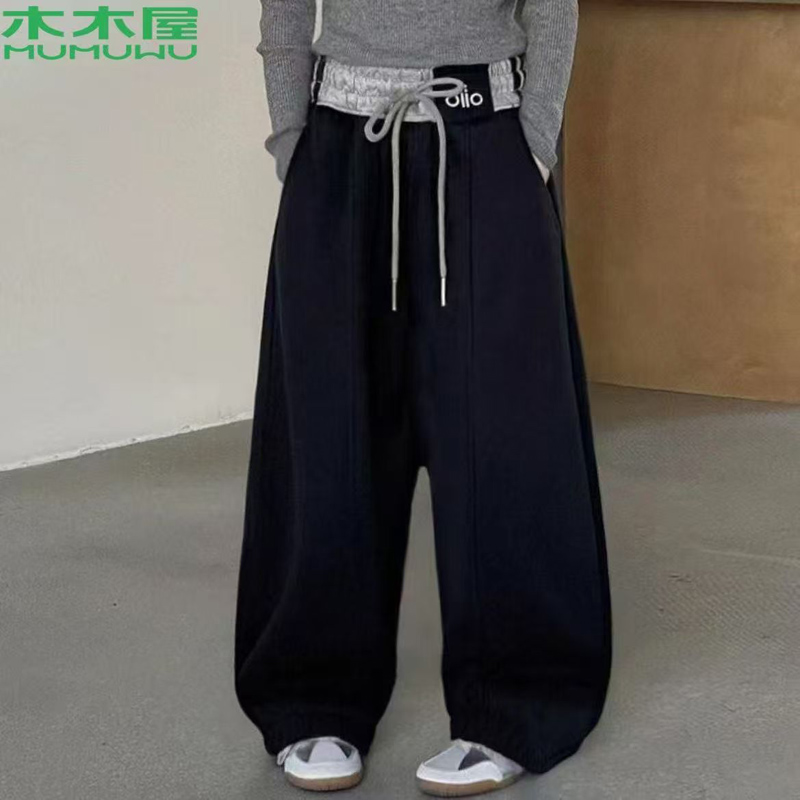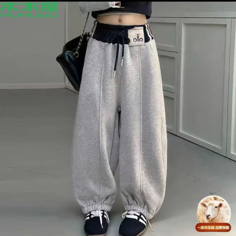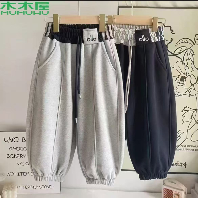 YF6906-(2色入内)美式加绒撞色高腰贴标束腿阔身休闲百搭时尚运动保暖裤