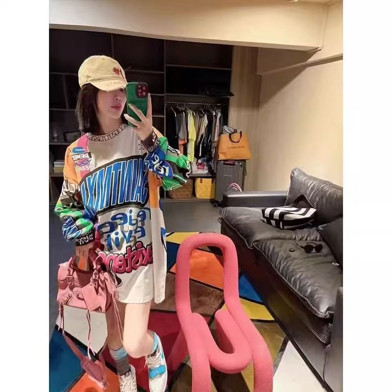 YF6908-图片色时尚大码字母个性涂鸦圆领长袖胖MM显瘦街头哈伦风上衣潮T