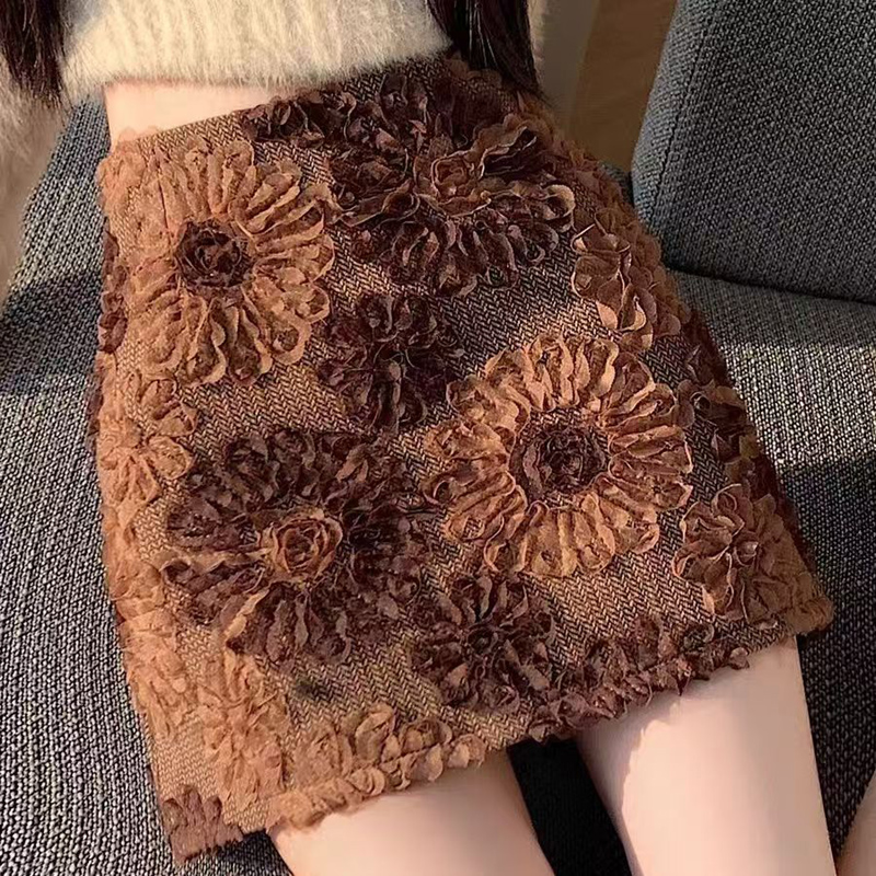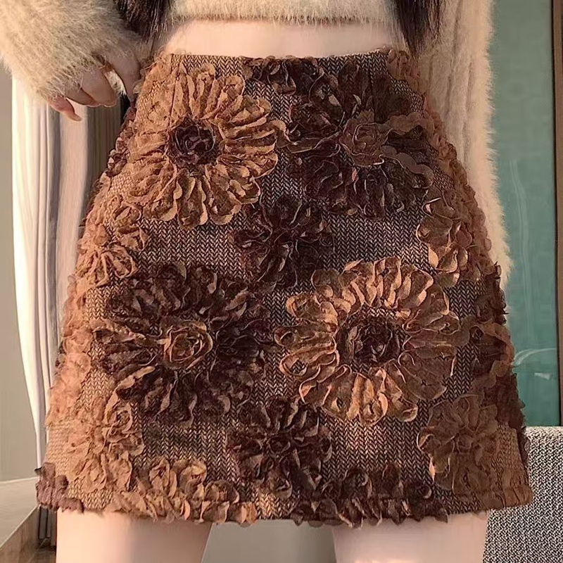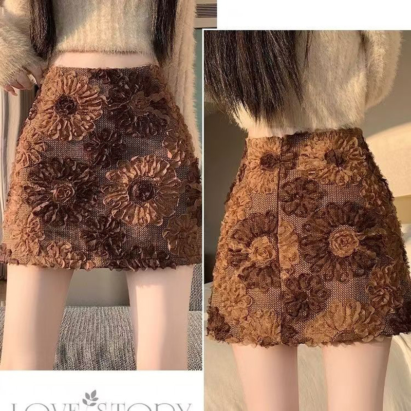 YF6912-图片色秋冬太阳花提花设计A字防走光衬暗拉链复古咖色高腰显瘦短裙