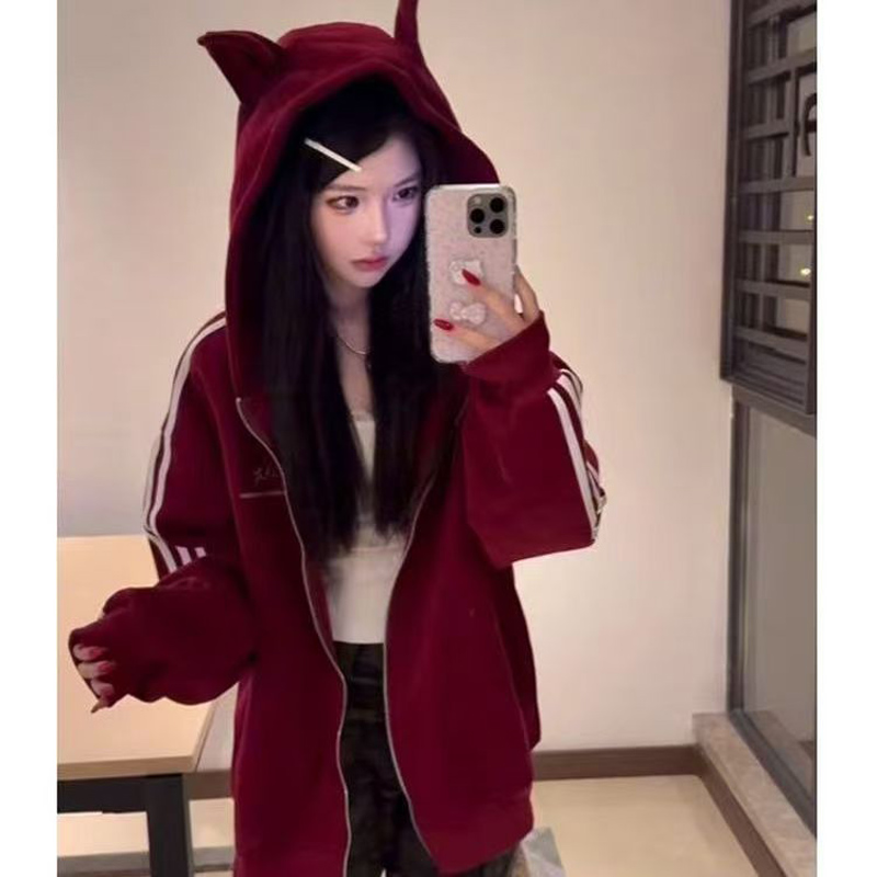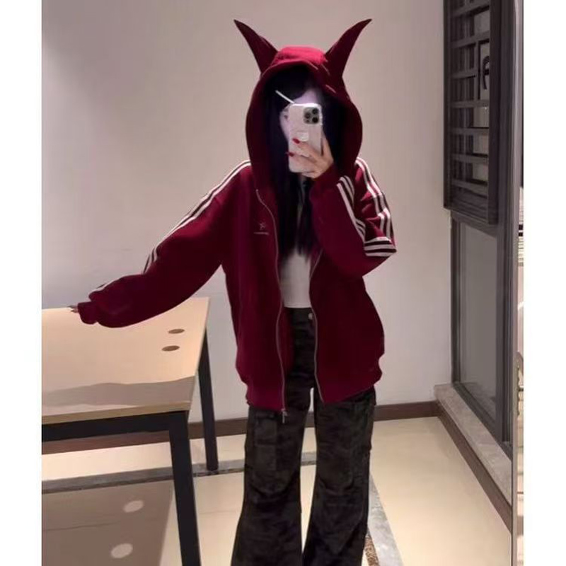 YF6915-图片色春秋复古风牛角帽子撞色条纹长袖拉链休闲百搭学院风卫衣潮