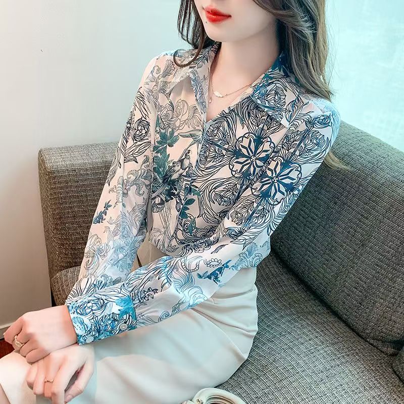 YF6923-图片色春装新款长袖翻领系扣藏青图腾印花碎花宽松大码上衣