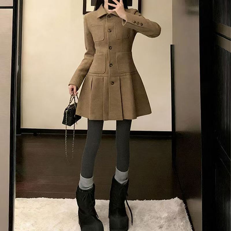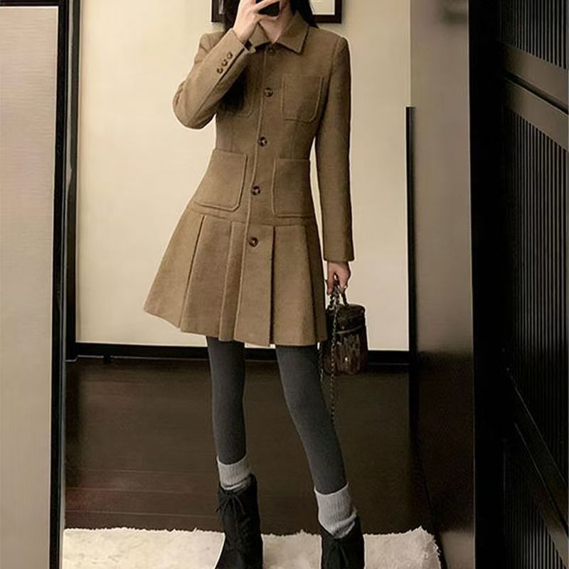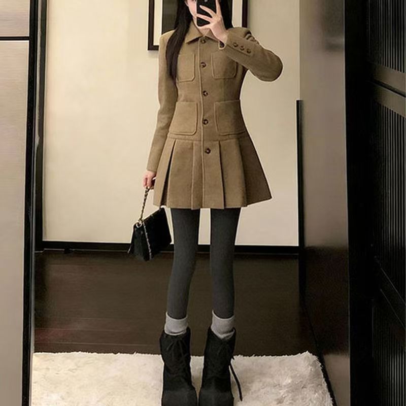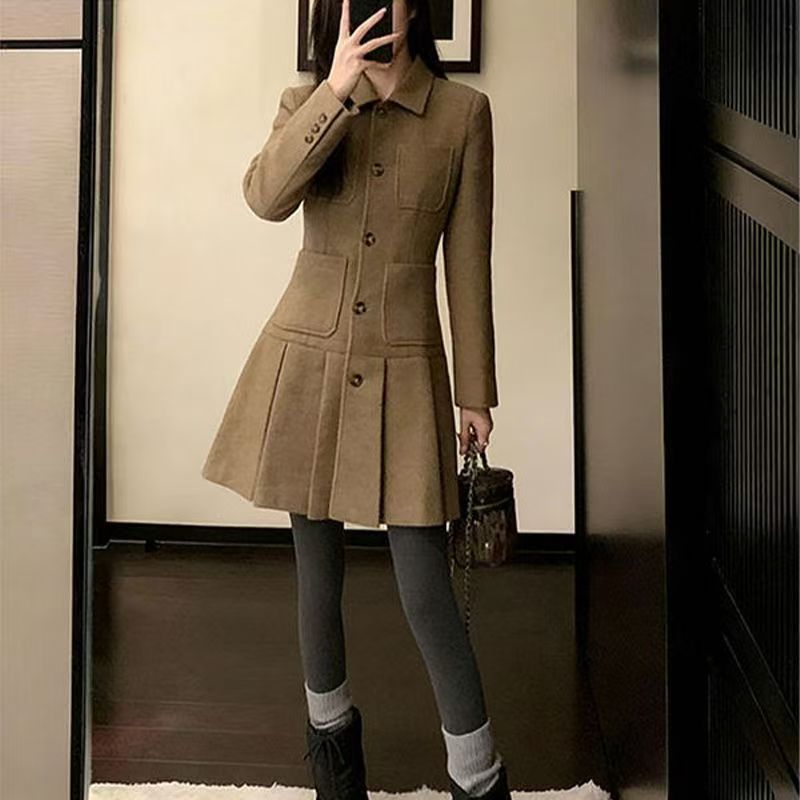 YF6925-图片色韩版温柔风长袖POLO领排扣褶折毛呢保暖高级感修身连衣裙