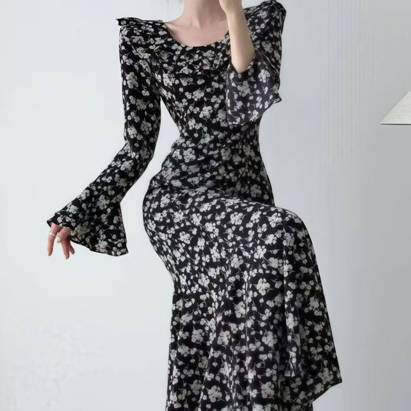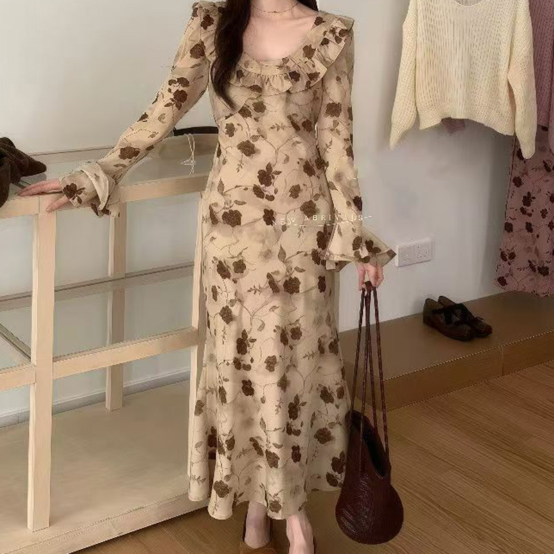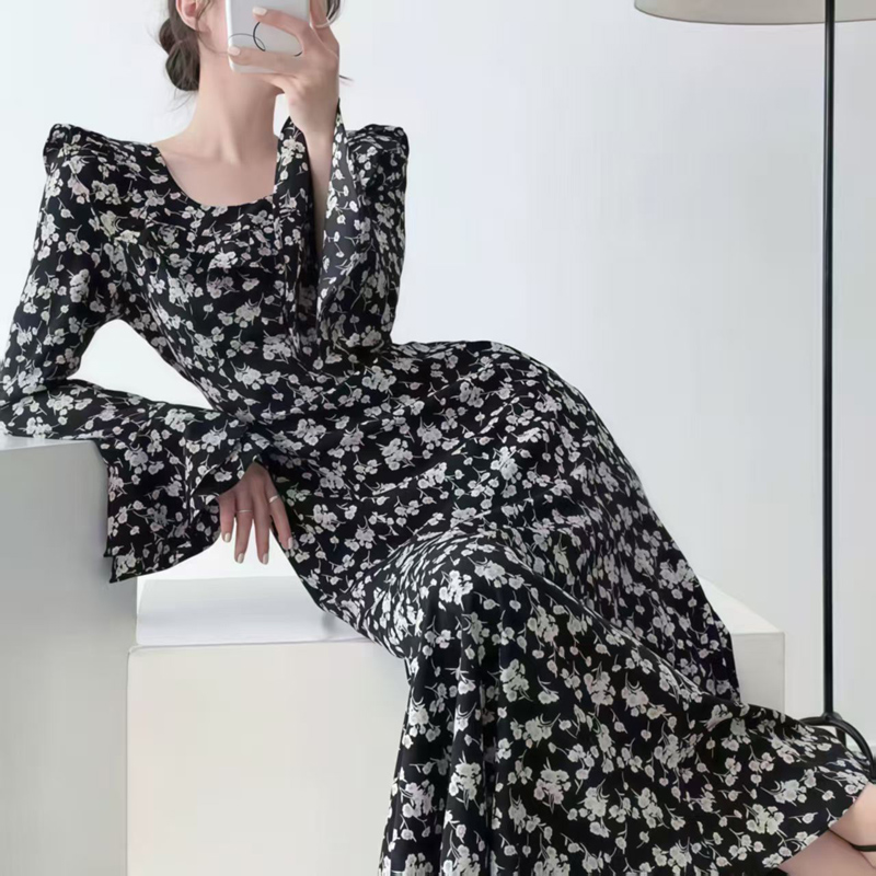 YF6930-(3色入内)韩版春装小飞袖荷叶边圆领修腰过膝中长款碎花别致连衣裙