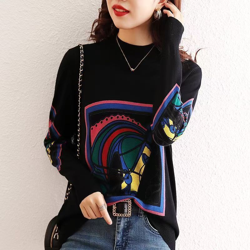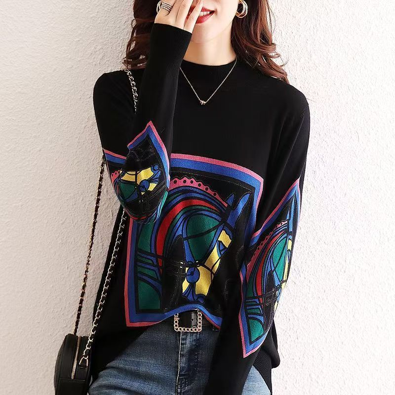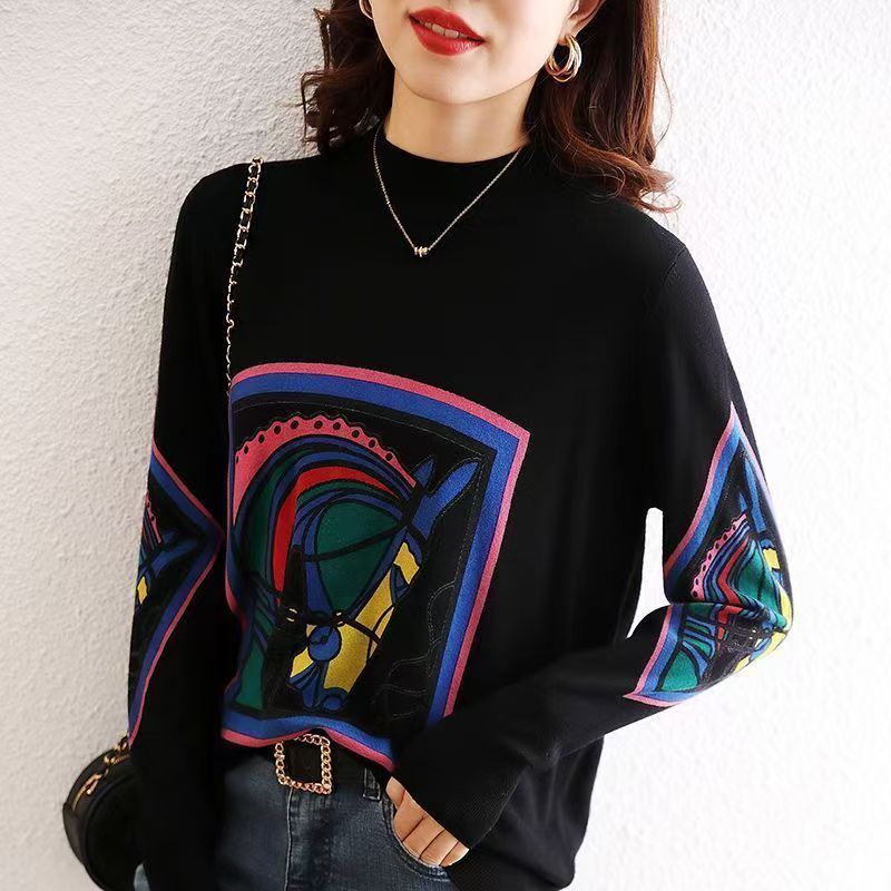 YF6931-图片色冬装时尚提花马头编织设计感长袖半高领宽松洋气针织上衣