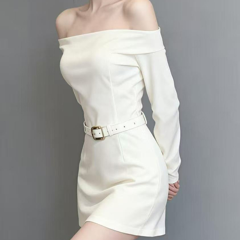 YF3932-图片色时尚春装纯欲风性感露脐长袖系腰显瘦包臀白色别致短款连衣裙