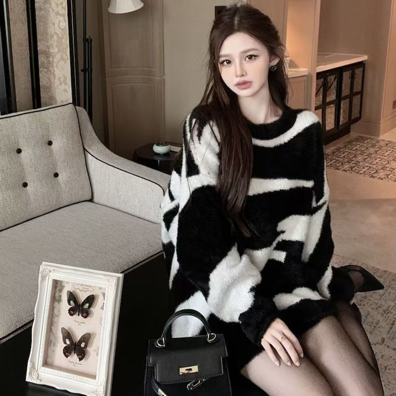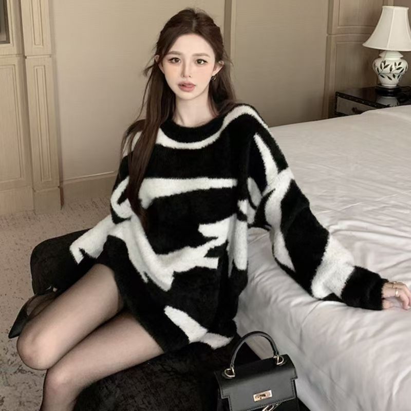 YF6957-图片色韩版冬装不规则黑白提花海马毛长袖圆领宽松大码通勤毛衣
