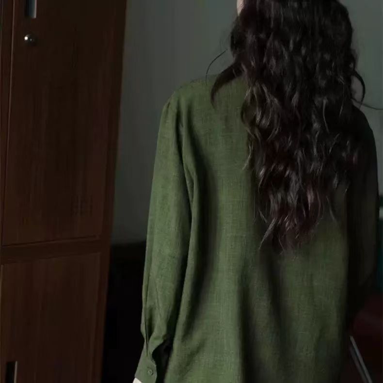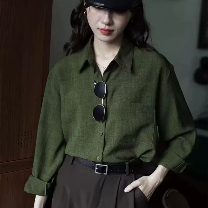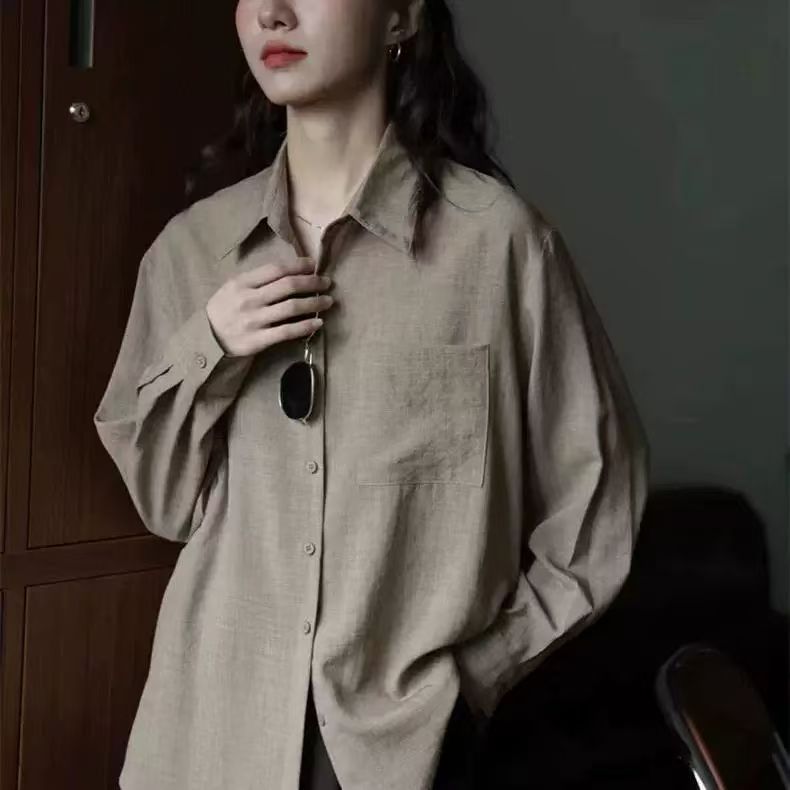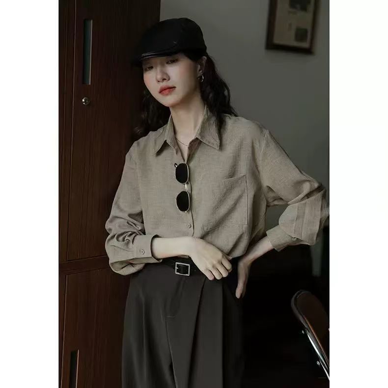 YF6959-(3色入内)简练时尚港式春秋复古设计长袖翻领宽松显瘦设计高级感衬衣