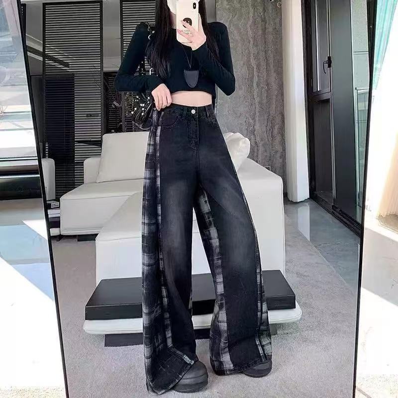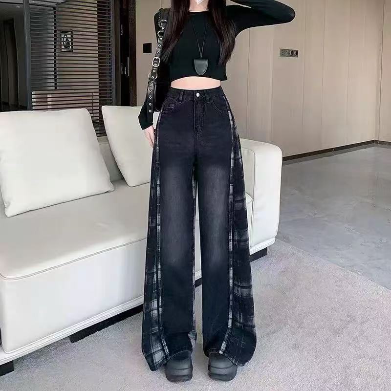 YF6961-图片色港式复古格纹拼接系扣高腰阔腿坠地感慵懒风胖MM显瘦牛仔裤