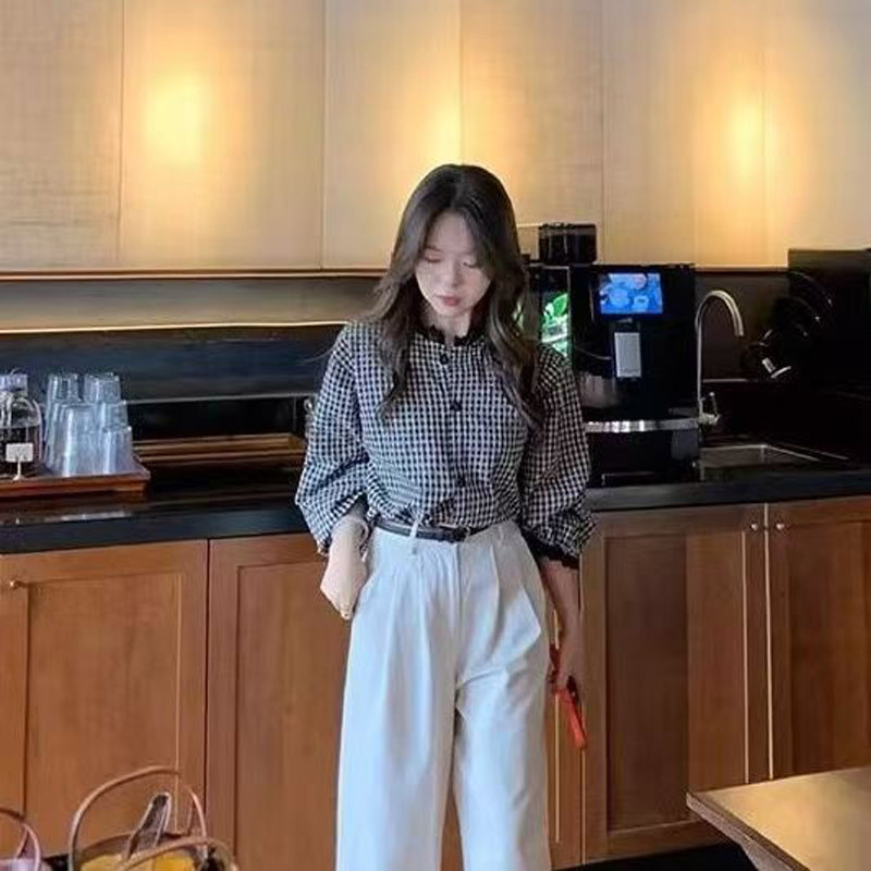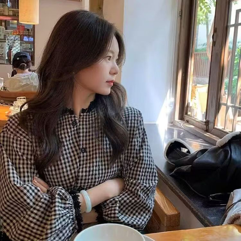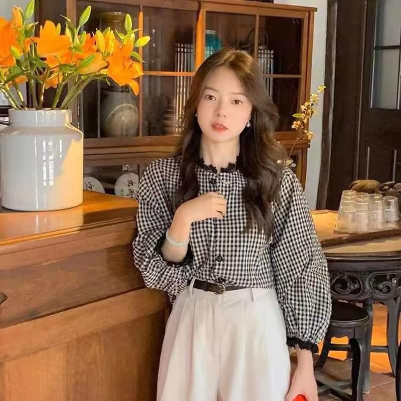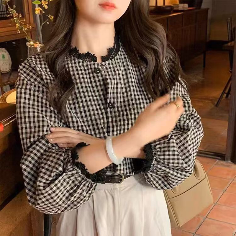 YF6962-图片色春装新款灯笼袖花边立领系扣复古格子大码显瘦蕾丝拼接上衣