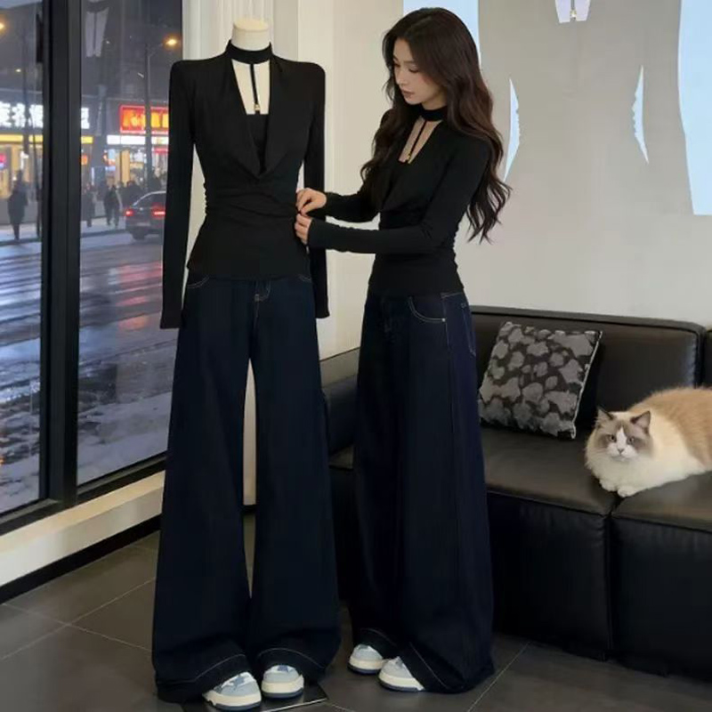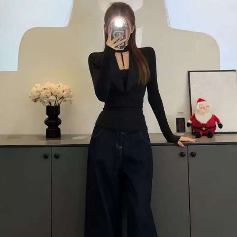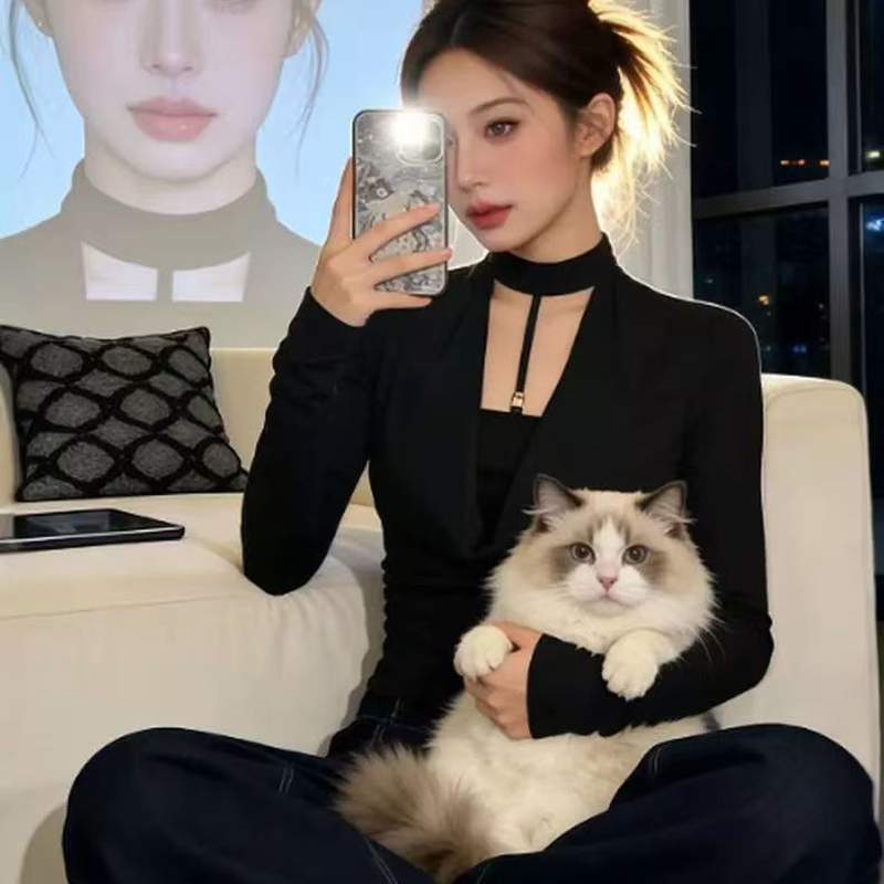YF6964-图片色辣妹新款镂空围脖假两件拼接长袖弹力修身黑色休闲T恤