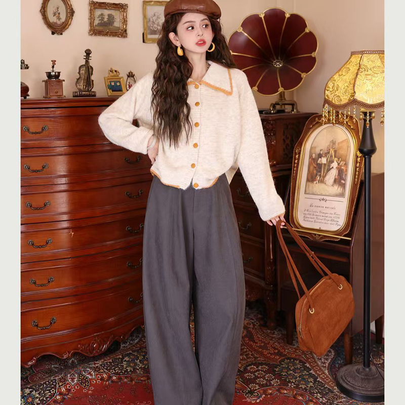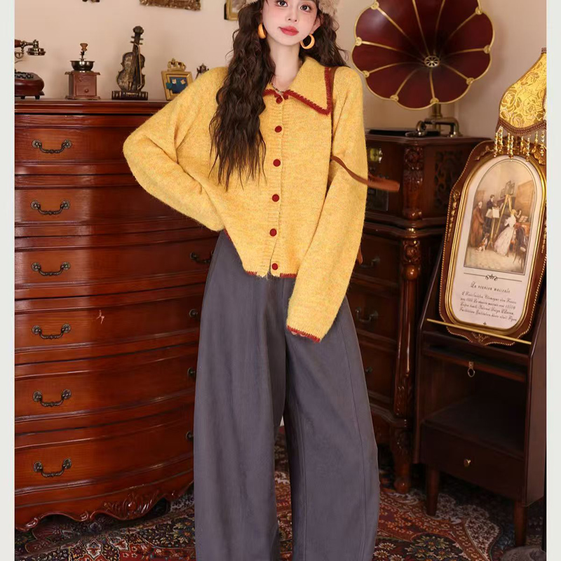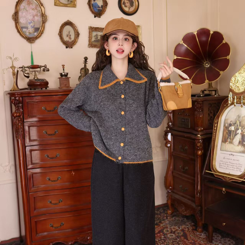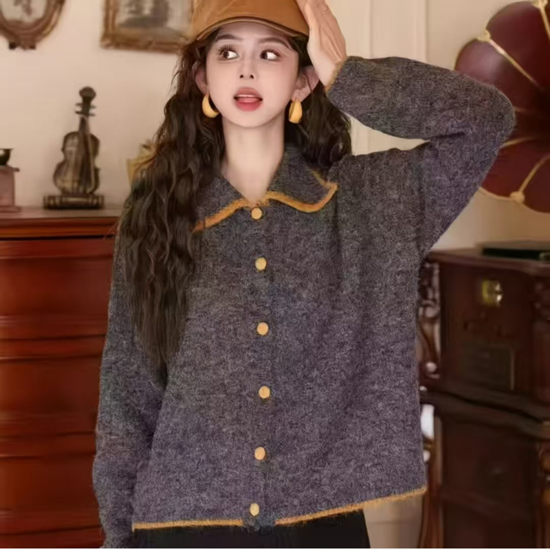 YF6968-(2色入内)甜美法式长袖翻领排扣磨毛围边撞色小众设计宽松针织上衣