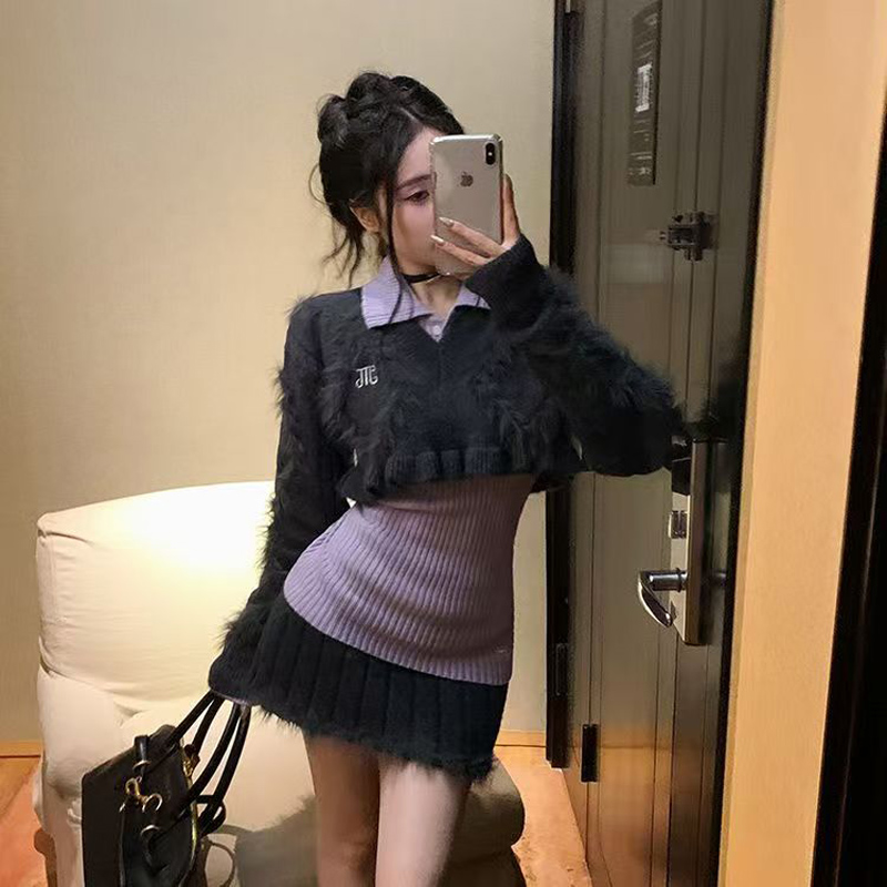 YF6970-(2色入内)性感时尚辣妹冬装松紧腰毛边坑条纹A字针织加厚防走光短裙