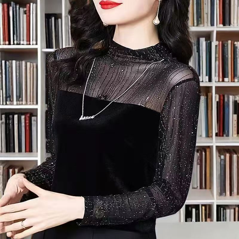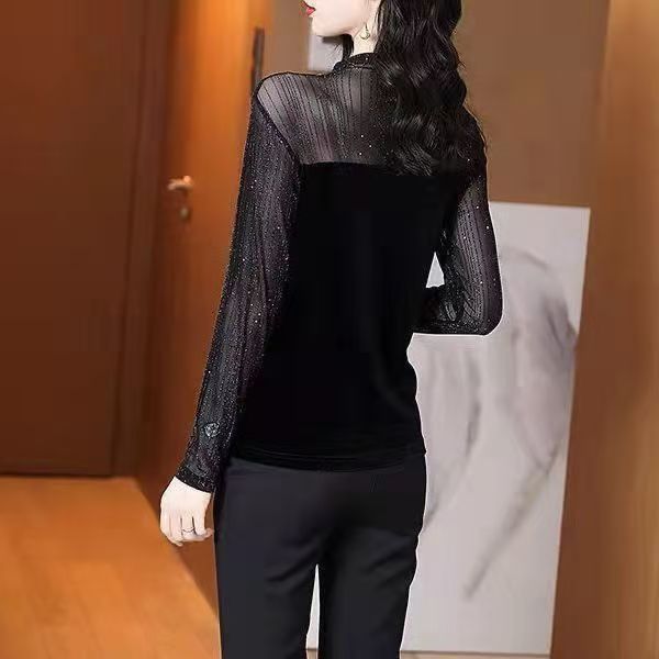 YF6973-图片色名媛气质烫金网纱拼接丝绒透视袖圆领宽松显瘦百搭打底衫