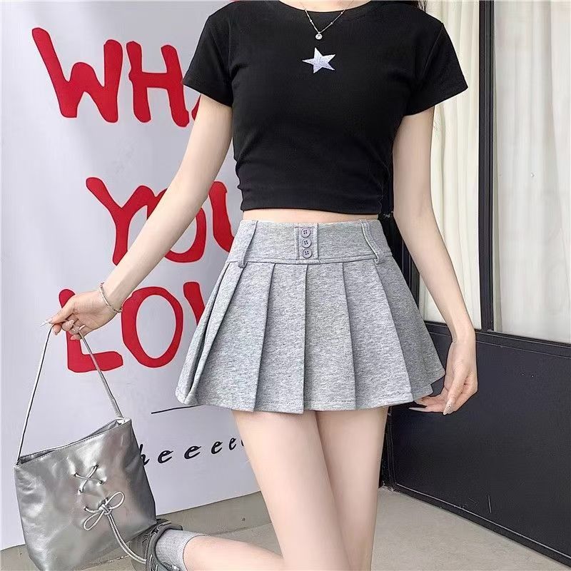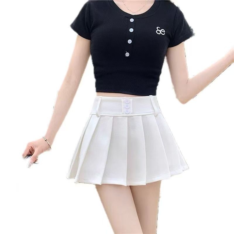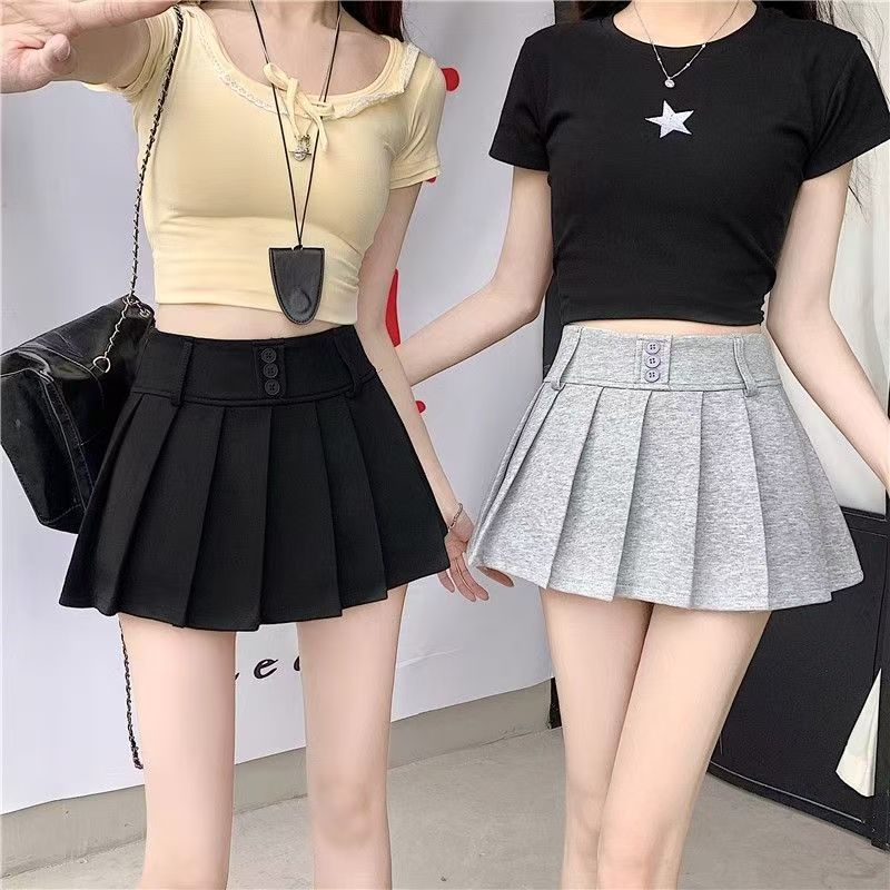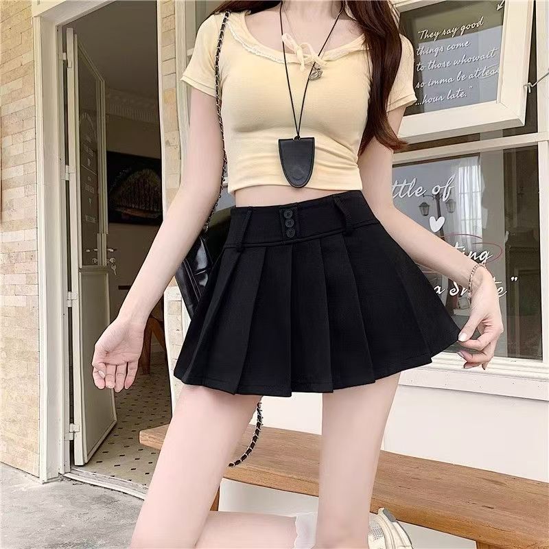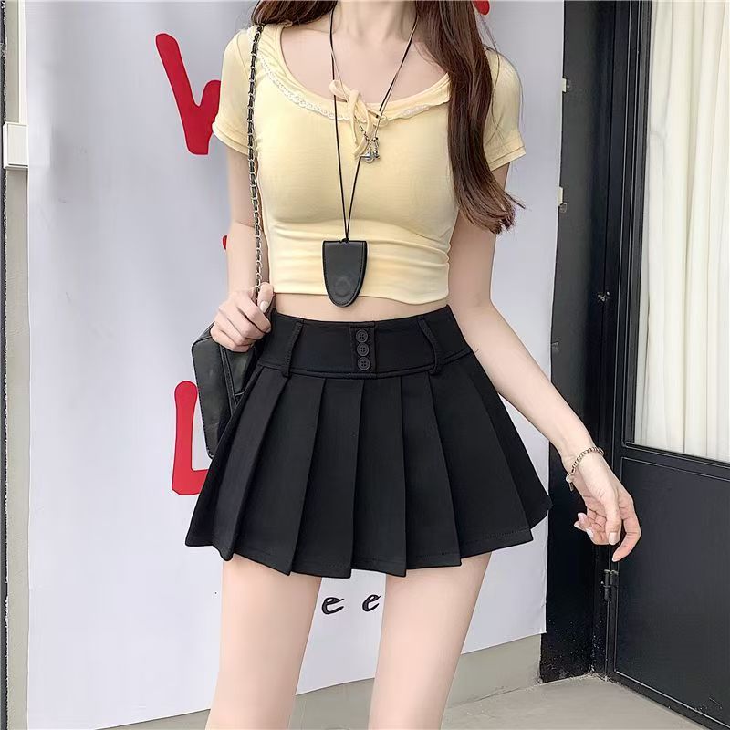 YF6977-(3色入内)性感小辣椒三颗扣高腰百褶A字防走光显瘦韩版半身