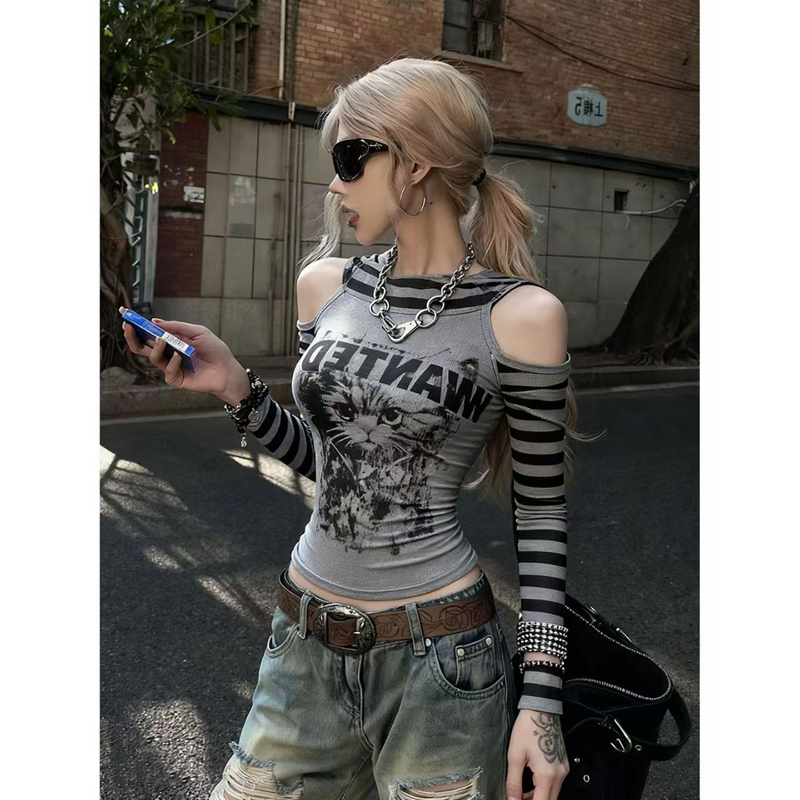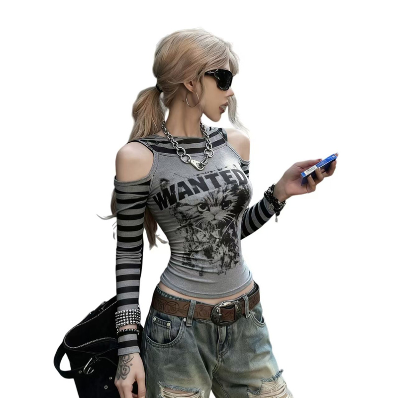 YF6978-图片色春装新款镂空长袖条纹拼接字母可爱猫猫印花辣妹T恤潮