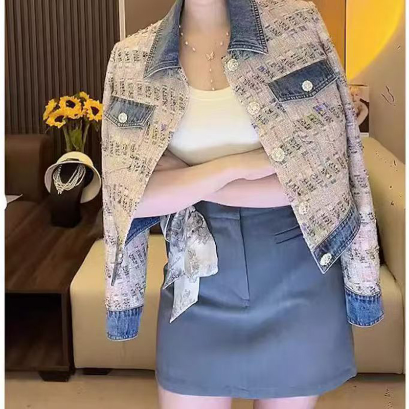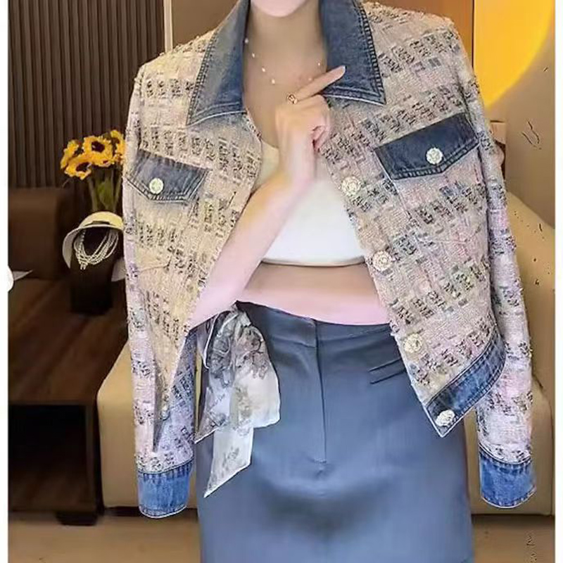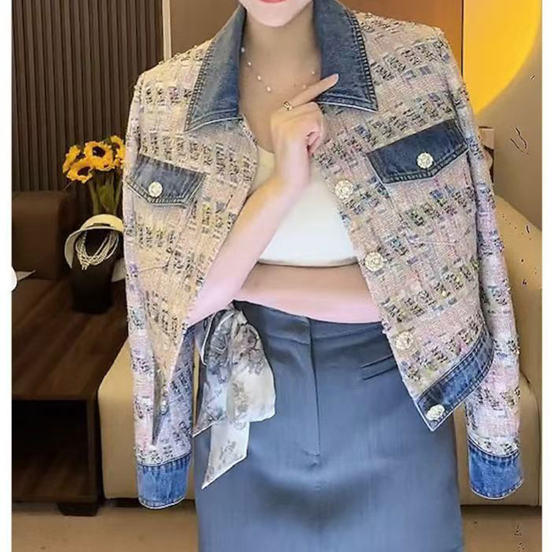 YF6982-图片色韩版小香风POLO领长袖系扣提花牛仔拼接宽松大码短装上衣