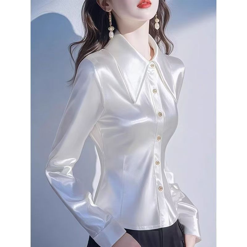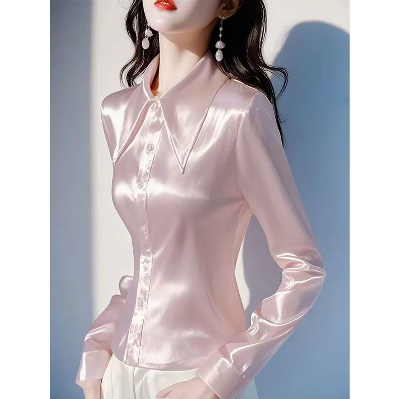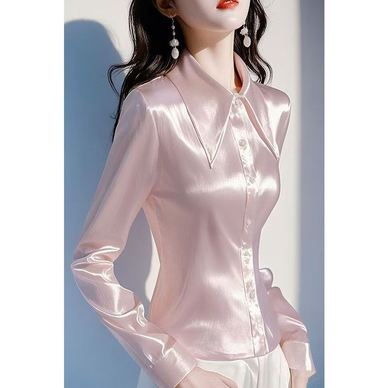 YF6984-图片色高级感绸面丝滑尖领系扣修身褶折长袖POLO领OL气质衬衫