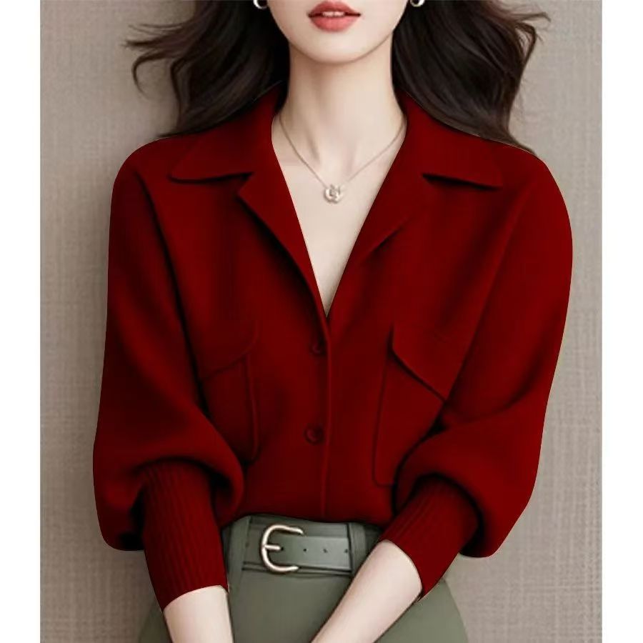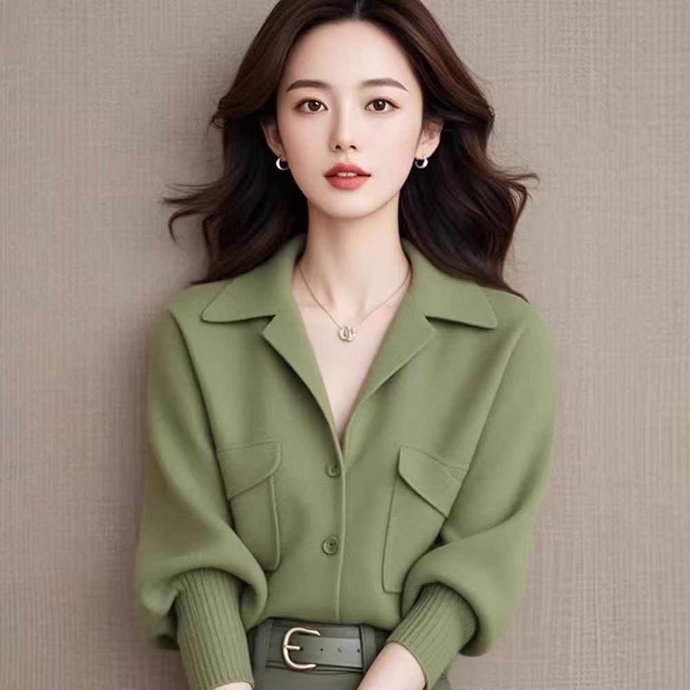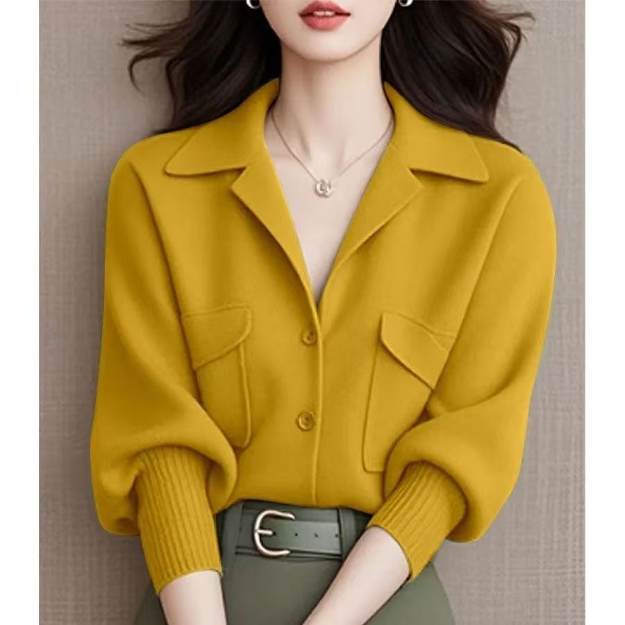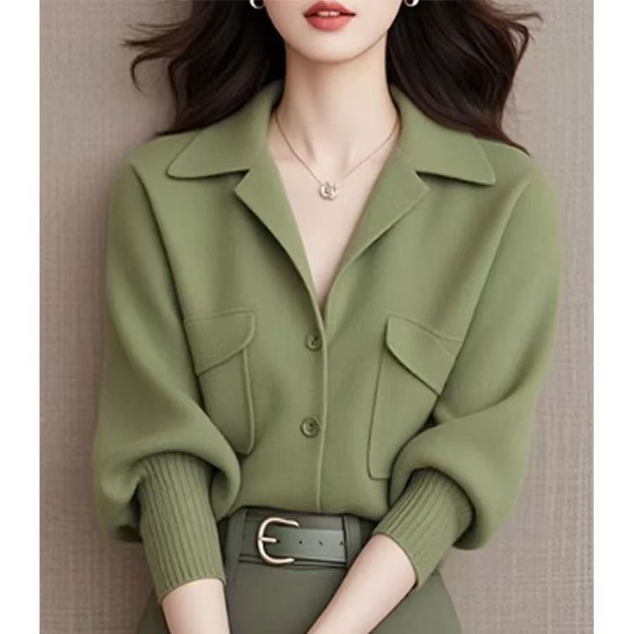 YF6987-(3色入内)冬装束袖西装领系扣双口袋宽松大码宽松显瘦针织上衣