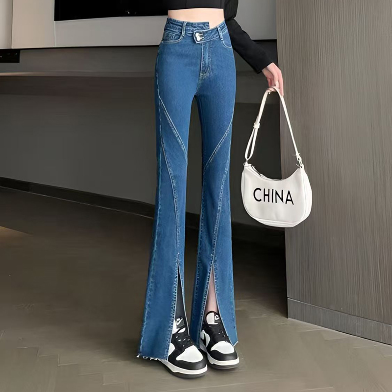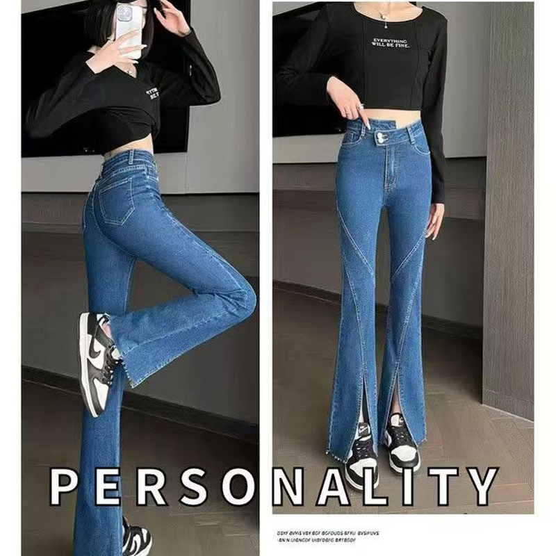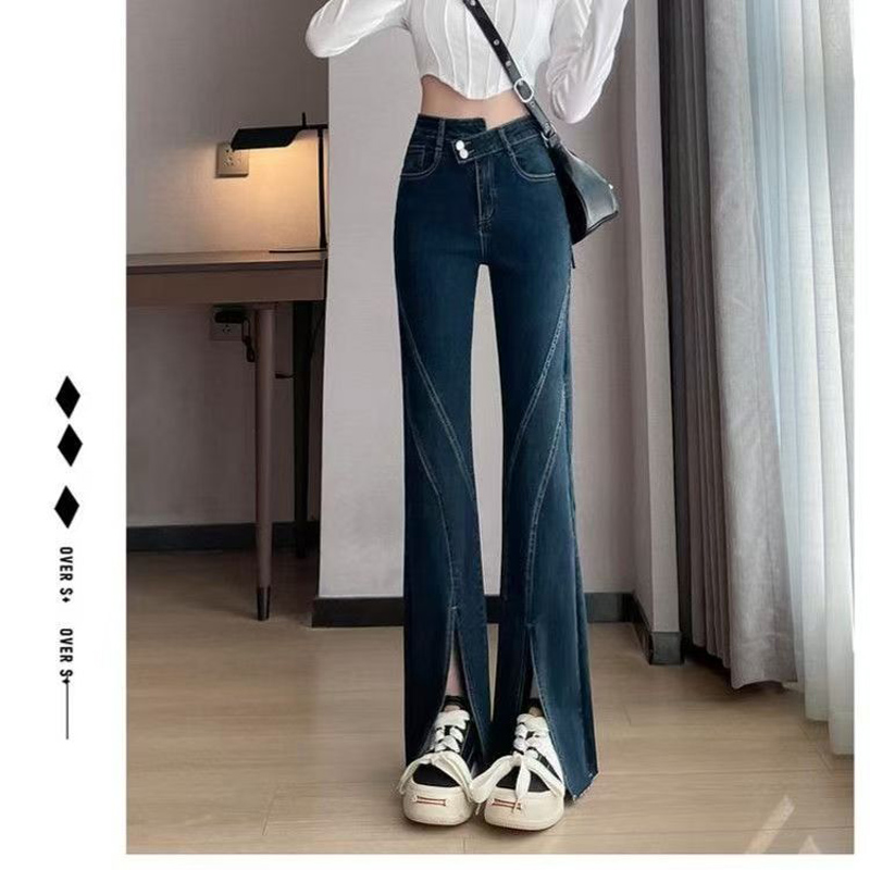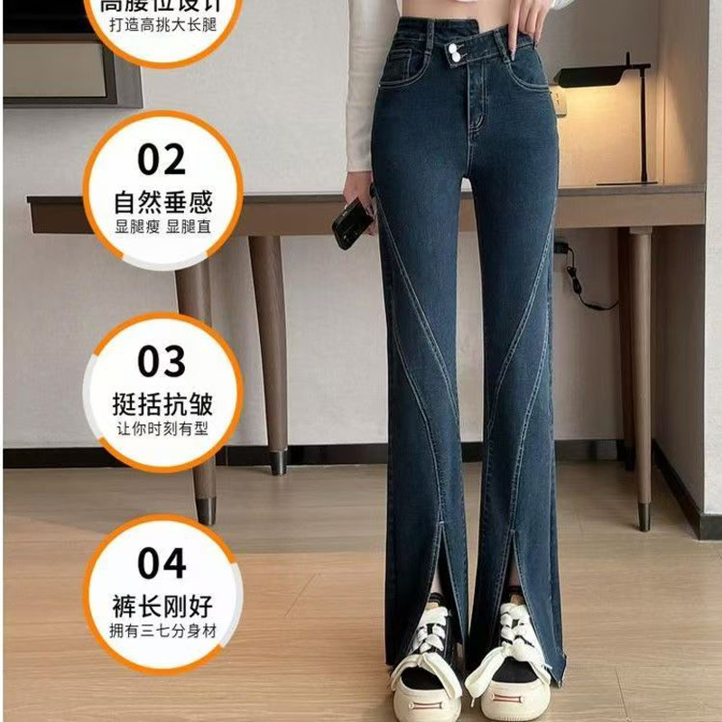 YF6988-(2色入内)港味不规则双纽扣高腰粗线条弧边设计开叉坠地感牛仔裤