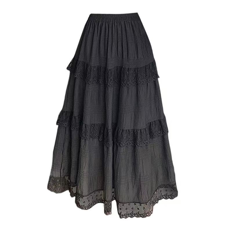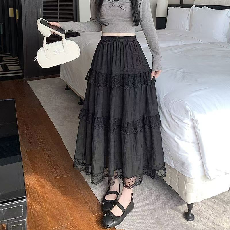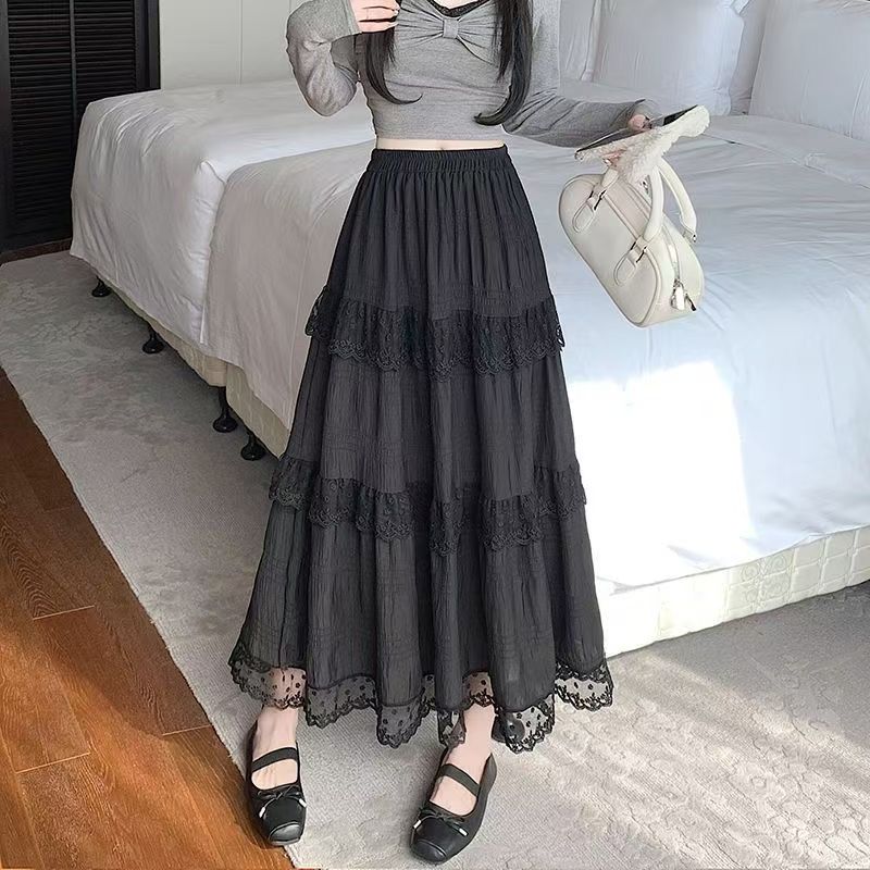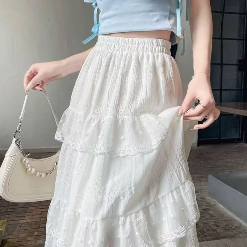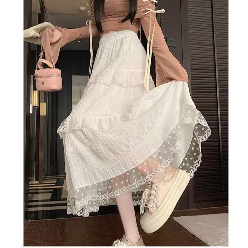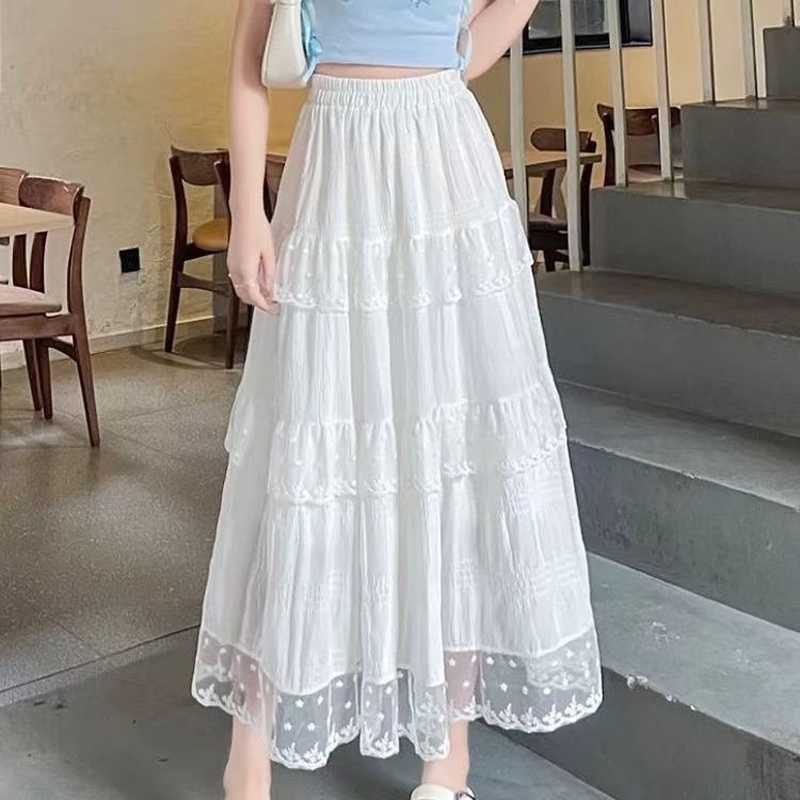 YF6994-(2色入内)春夏甜美白色蕾丝拼接A字大摆中长款设计松紧腰坠地感法式长裙