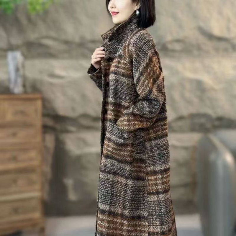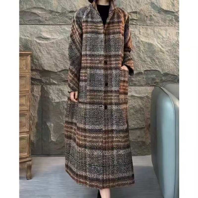 YF6998-图片色韩版秋冬时尚复古格子长袖翻领过膝中长款呢子大衣外套