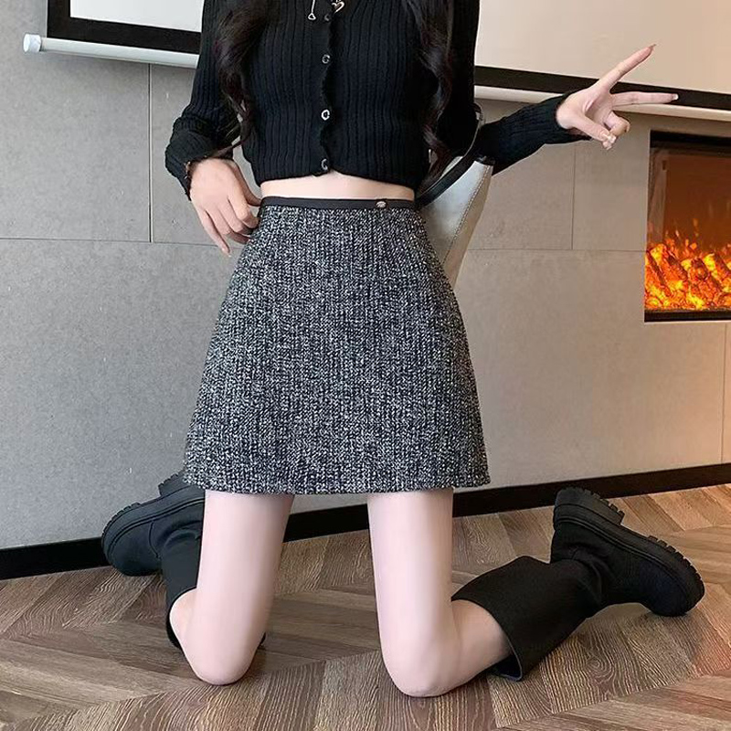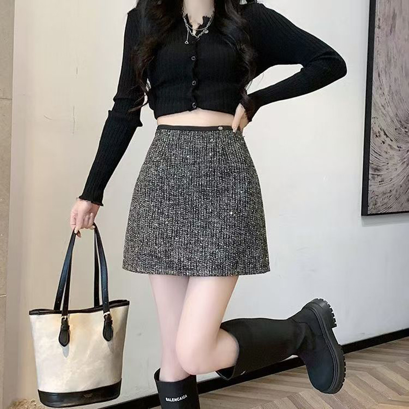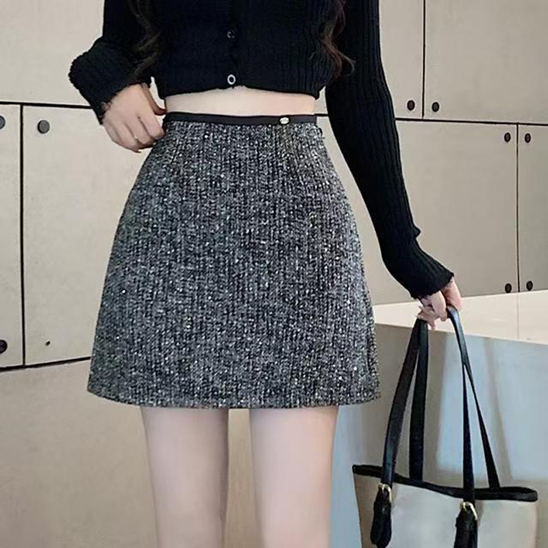 YF7001-图片色秋冬亮片粗毛呢设计A字包臀显瘦韩版复古小香风半身裙
