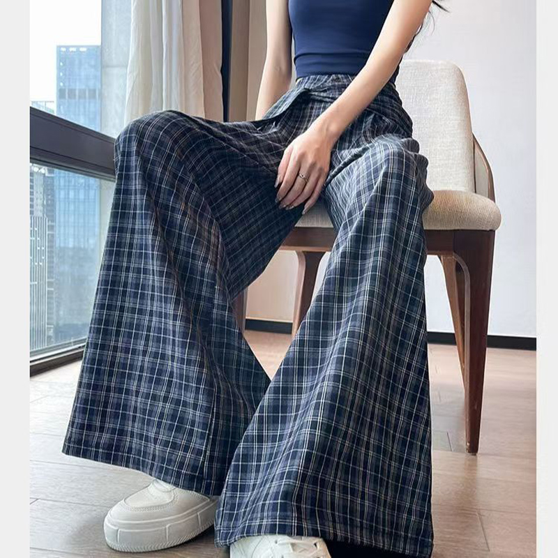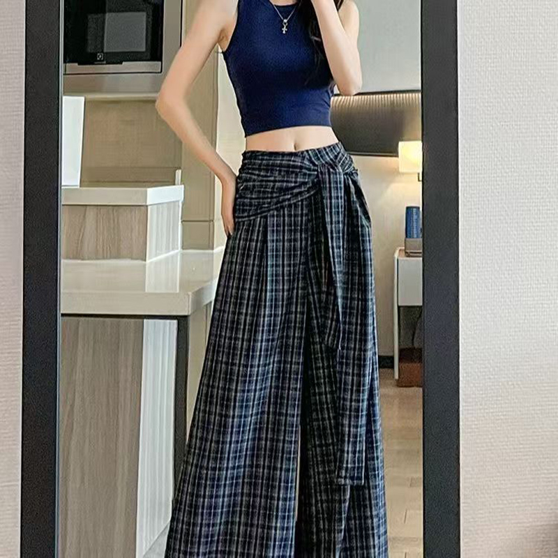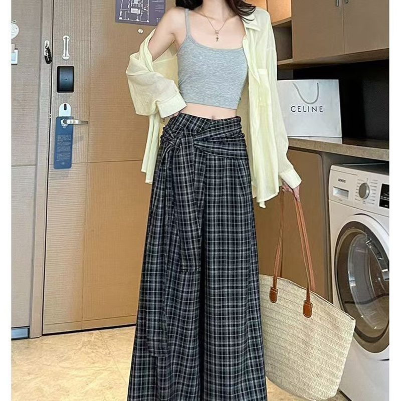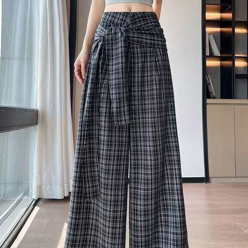 YF7005-(2色入内)春秋百搭假两件绑带系腰显瘦直筒阔腿复古格子坠地感休闲裤