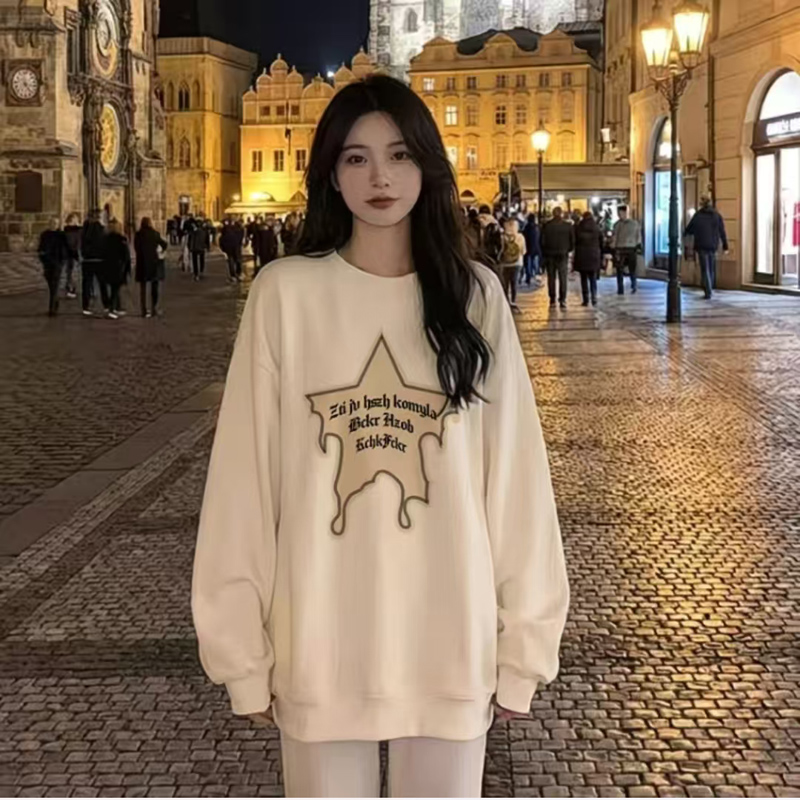 YF7010-(2色入内)学院风春秋新款可爱星印花慵懒风圆领长袖简约卫衣潮