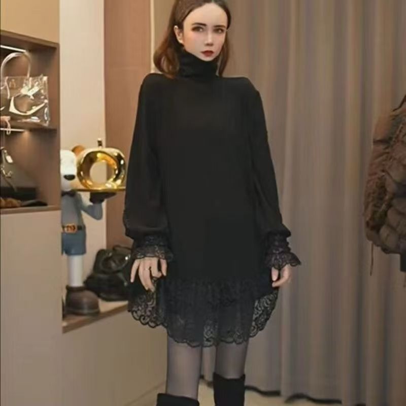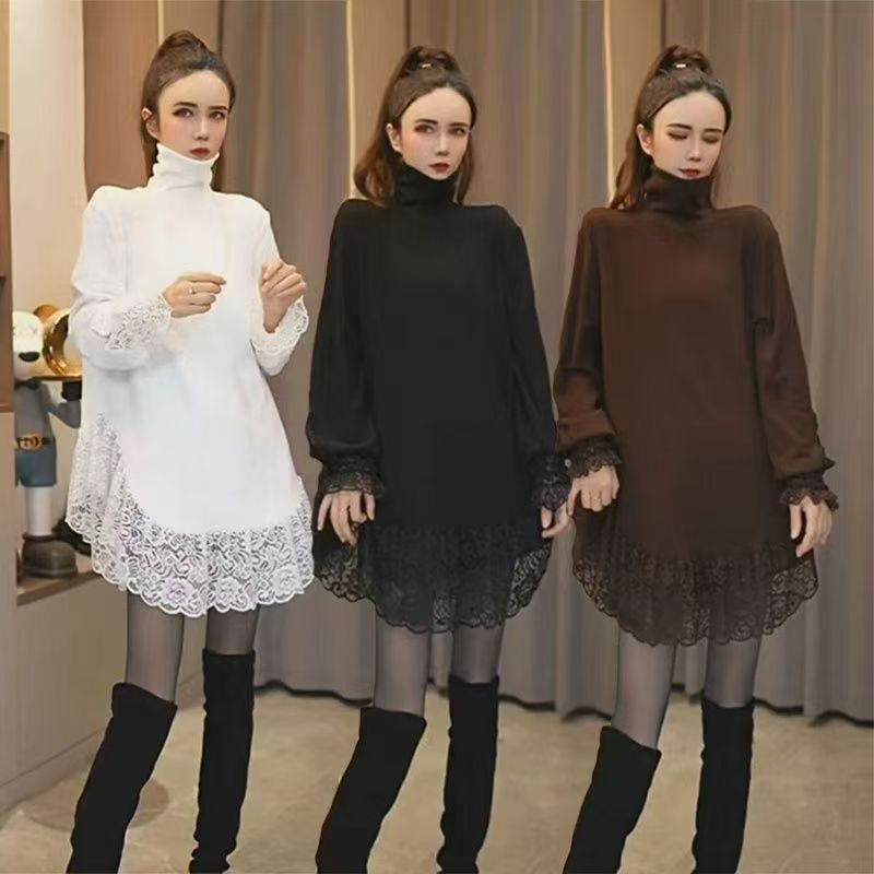 YF7015-(3色入内)春秋时尚胖MM显瘦A字蕾丝拼接高领长袖中长款别致上衣