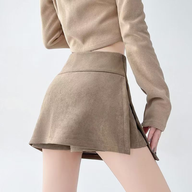YF7032-(3色入内)韩版时尚冬季磨沙仿皮系扣A字开叉假两件辣妹复古气质短裙