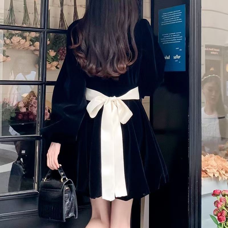 YF7034-图片色赫本风春秋时尚灯茏袖套头撞色蝴蝶结收腰显瘦丝绒高级感连衣裙