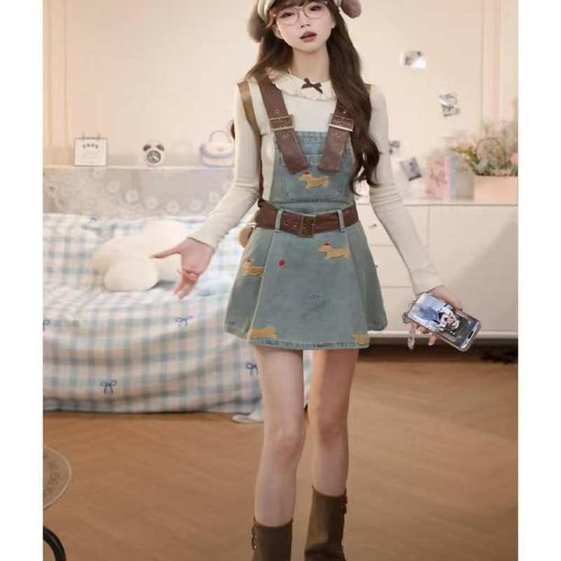 YF7036-图片色小可爱狗狗刺绣吊带系扣复古蓝夏季新款收腰牛仔连衣裙