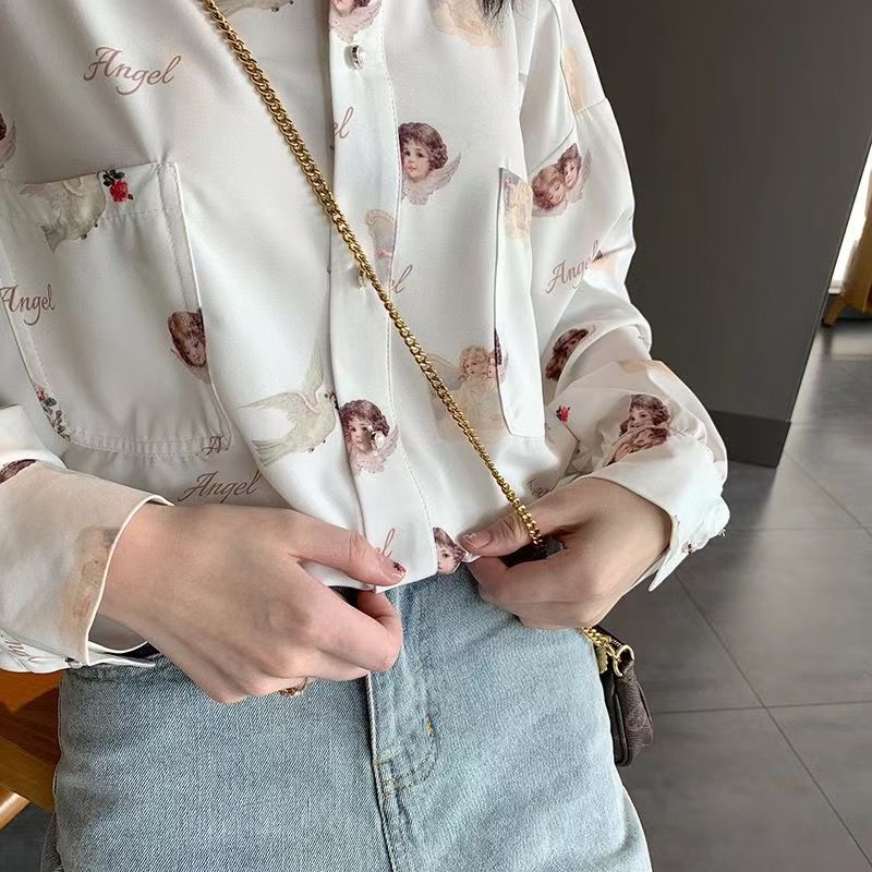 YF7037-图片色原宿风长袖翻领可爱天使印花长袖宽松显瘦港式复古雪纺衫