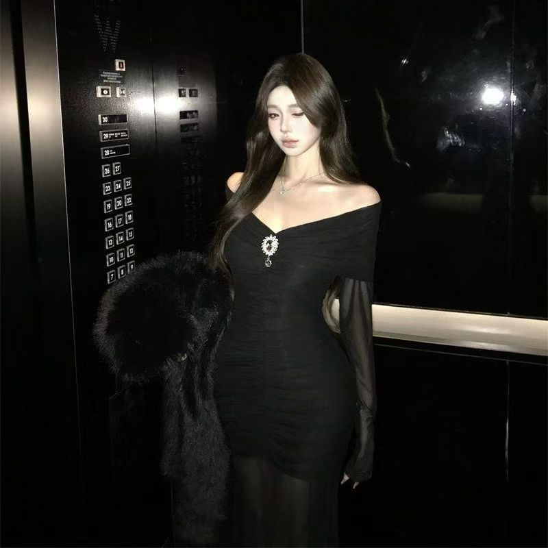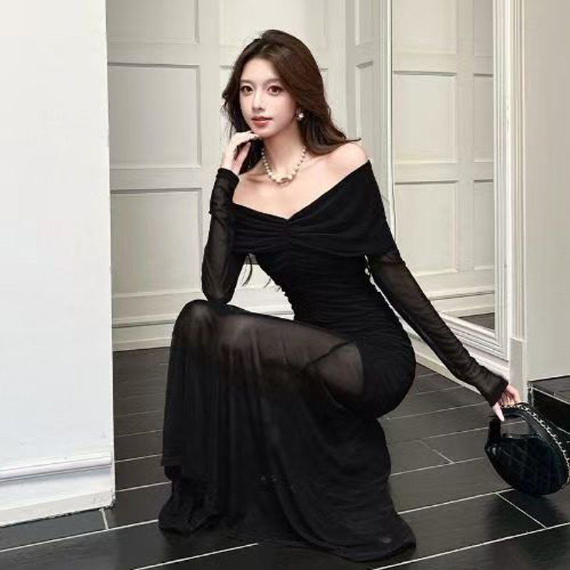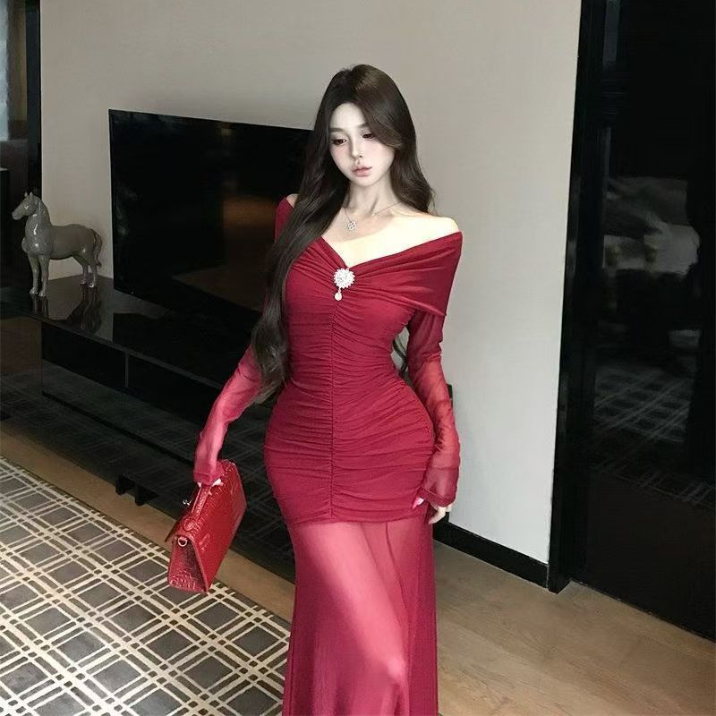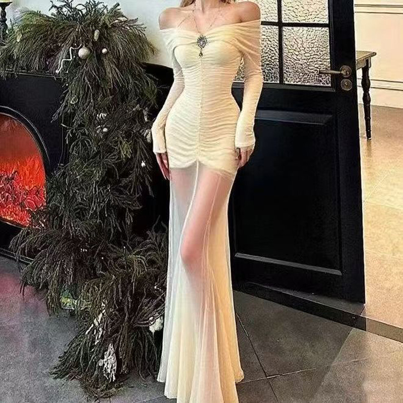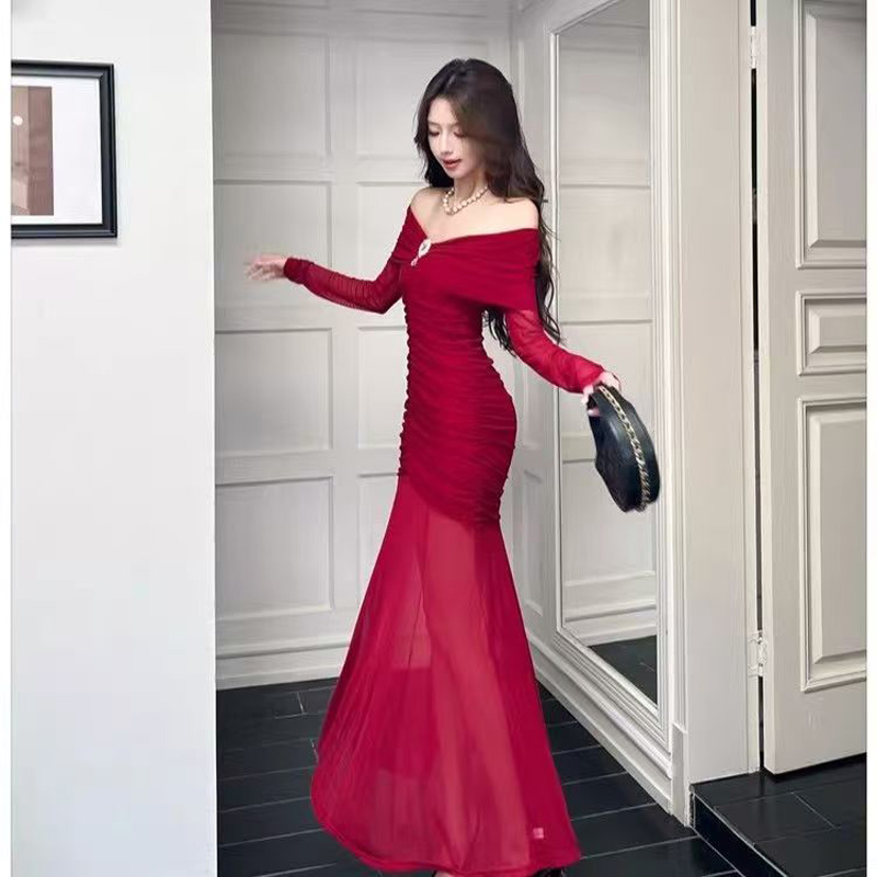 YF7042-(3色入内)名媛气质一字肩披肩感褶折钉珠弹力修腰包臀鱼尾网纱设计连衣裙