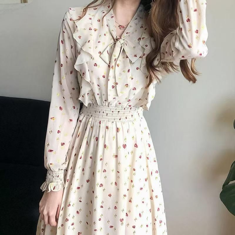 YF7044-图片色赫本风蝴蝶结松紧腰显瘦碎花印花小众长袖春装新款雪纺连衣裙