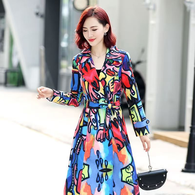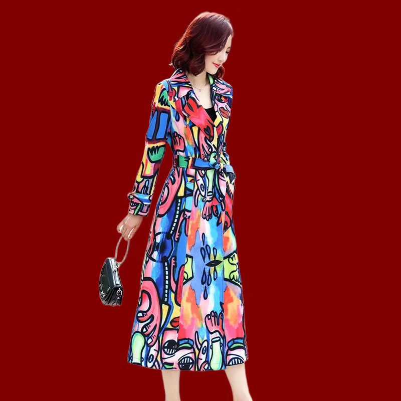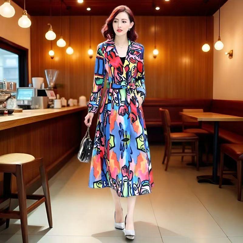 YF7060-图片色欧美不规则扎染印花系漫画设计长袖V领收腰过膝长款连衣裙