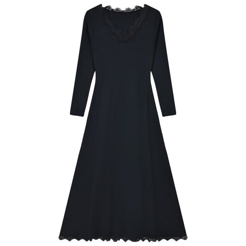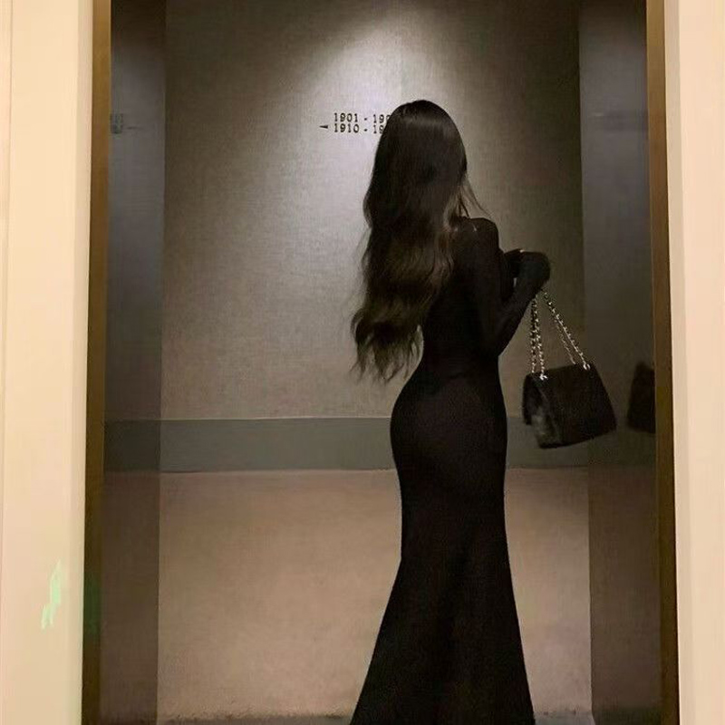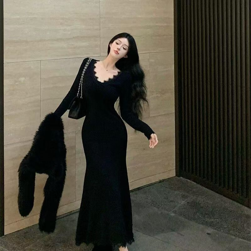 YF7064-图片色赫本风黑色长袖蕾丝卷边弹力包臀收腰显瘦坠地感鱼尾连衣裙
